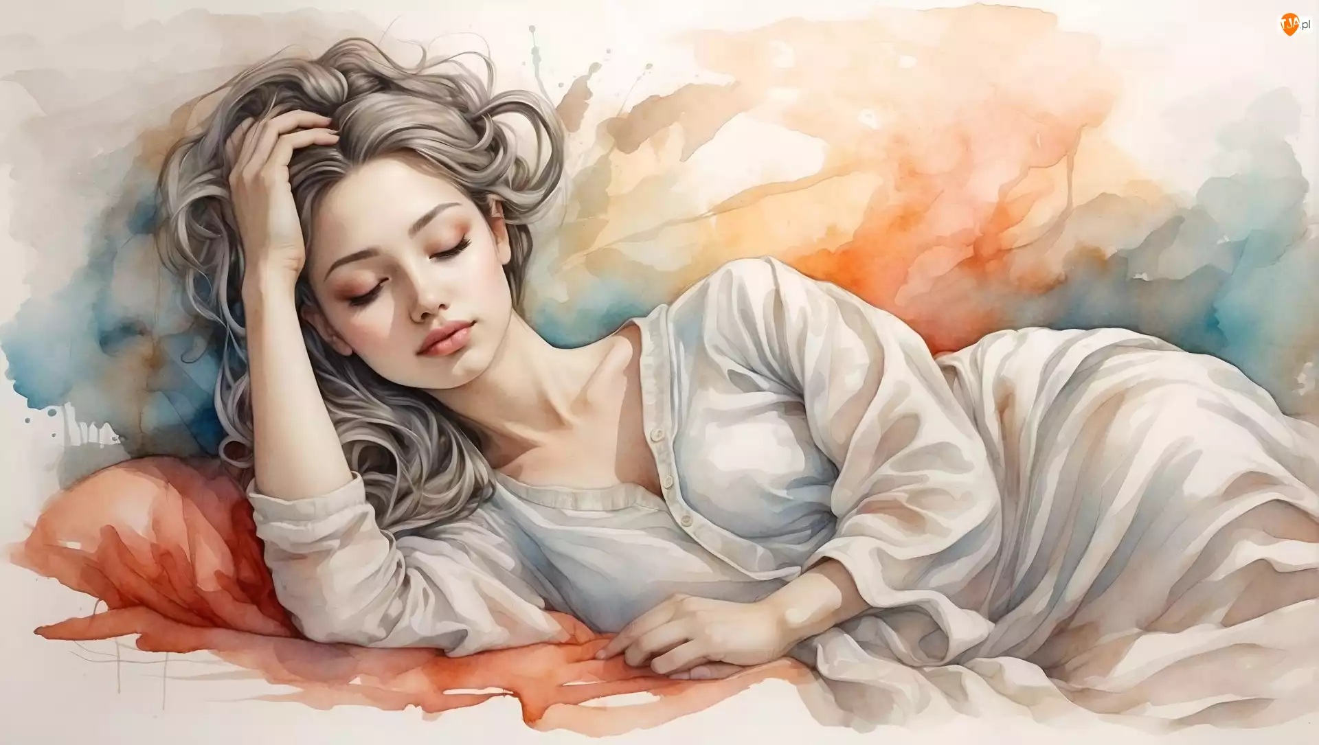 Łóżko, Dziewczyna, Akwarela, Grafika, Poduszki, Obraz