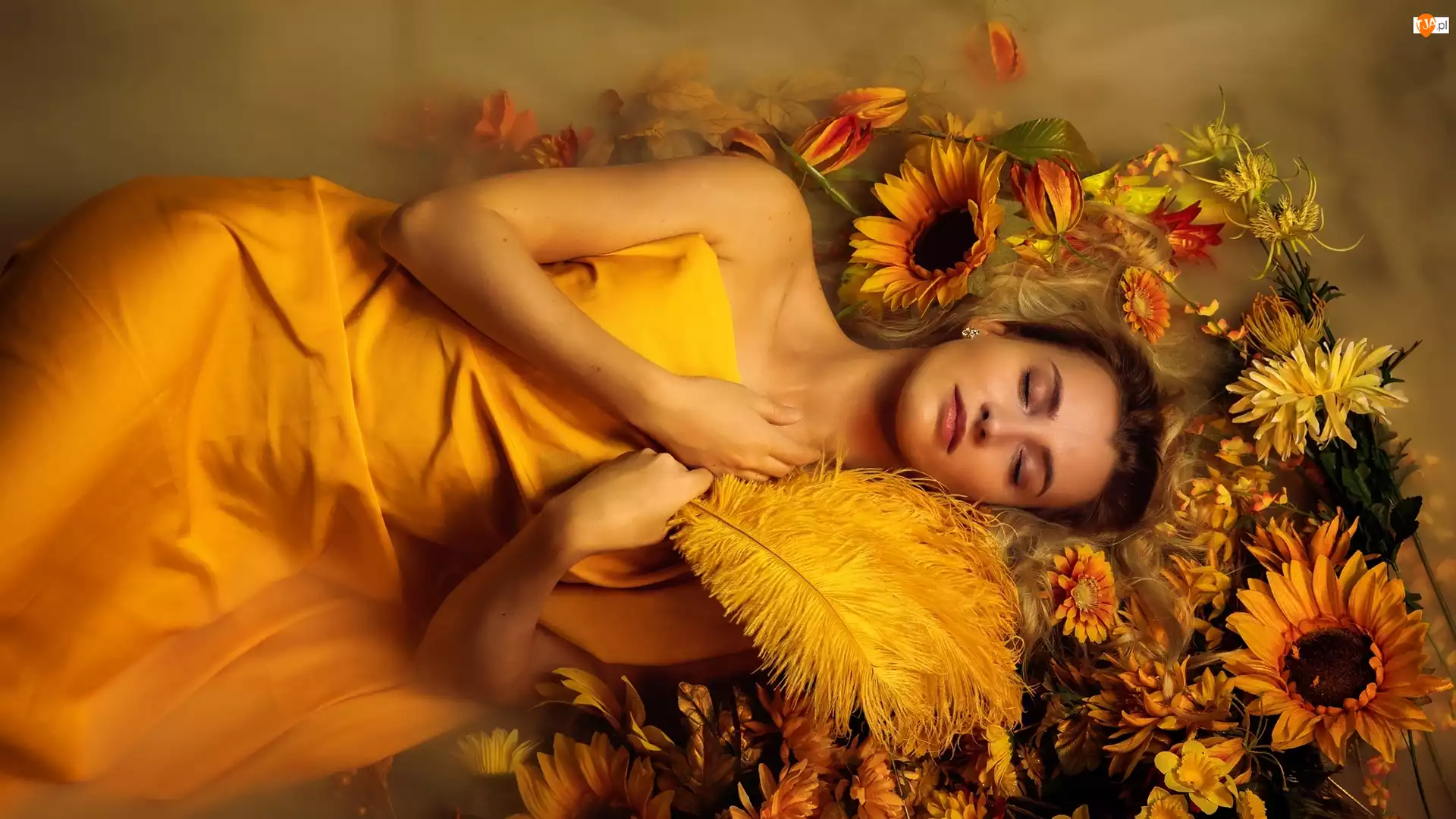 Słoneczniki, Śpiąca, Okrycie, Wachlarz, Kobieta, Kwiaty, Pióra, Żółte