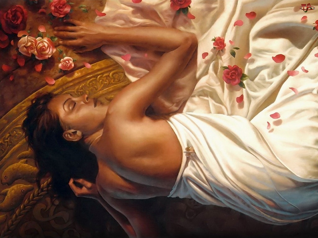 Śpiąca, Róże, Kobieta, Prześcieradło