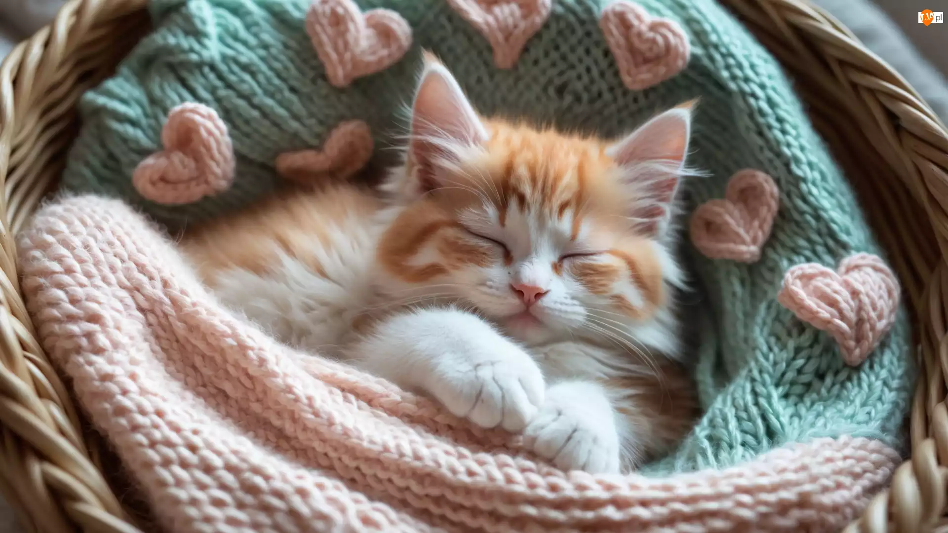Śpiący, Mały, Kot, Kocyk, Rudo-biały, Koszyk