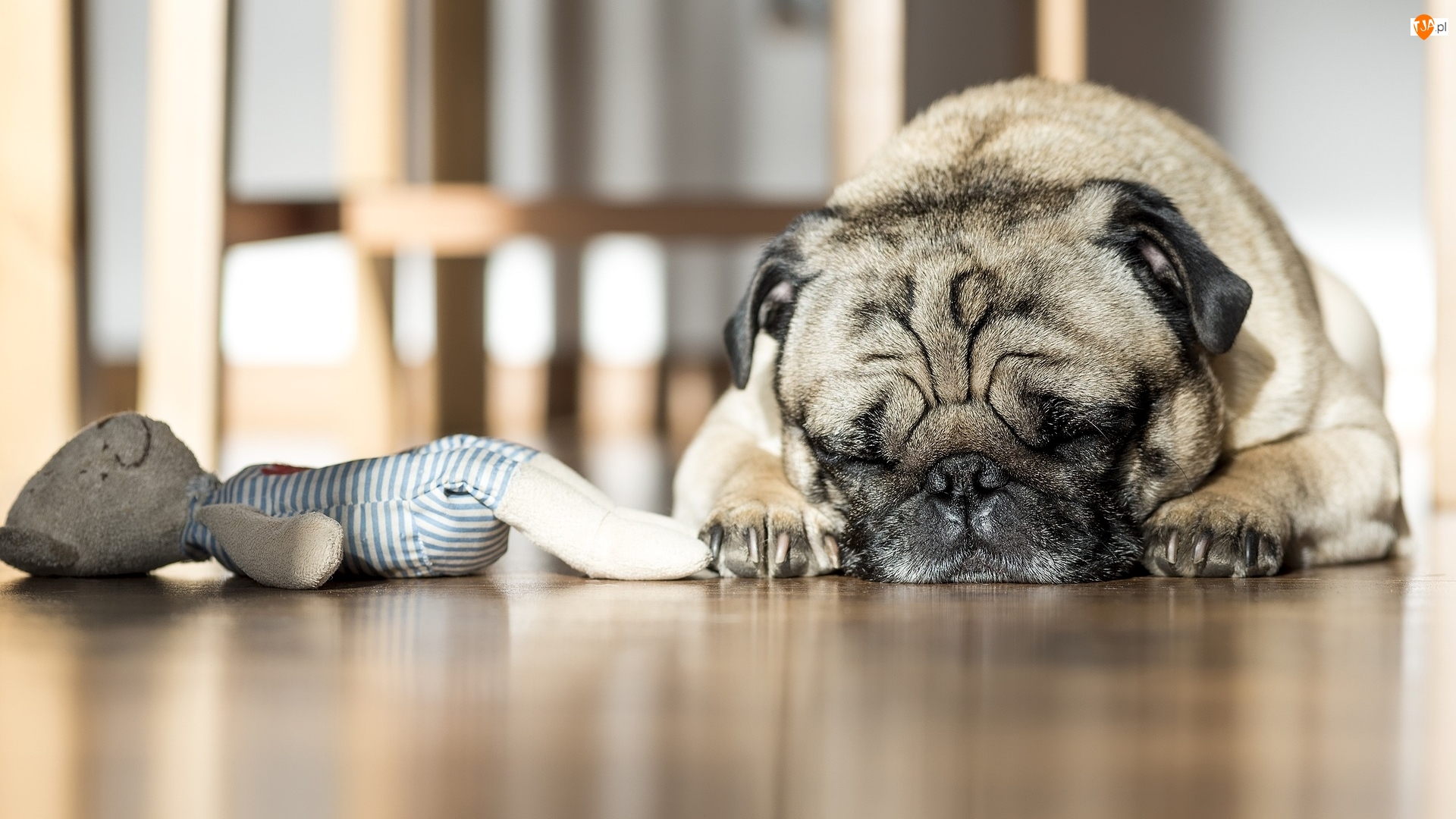 Śpiący z zabawką mops