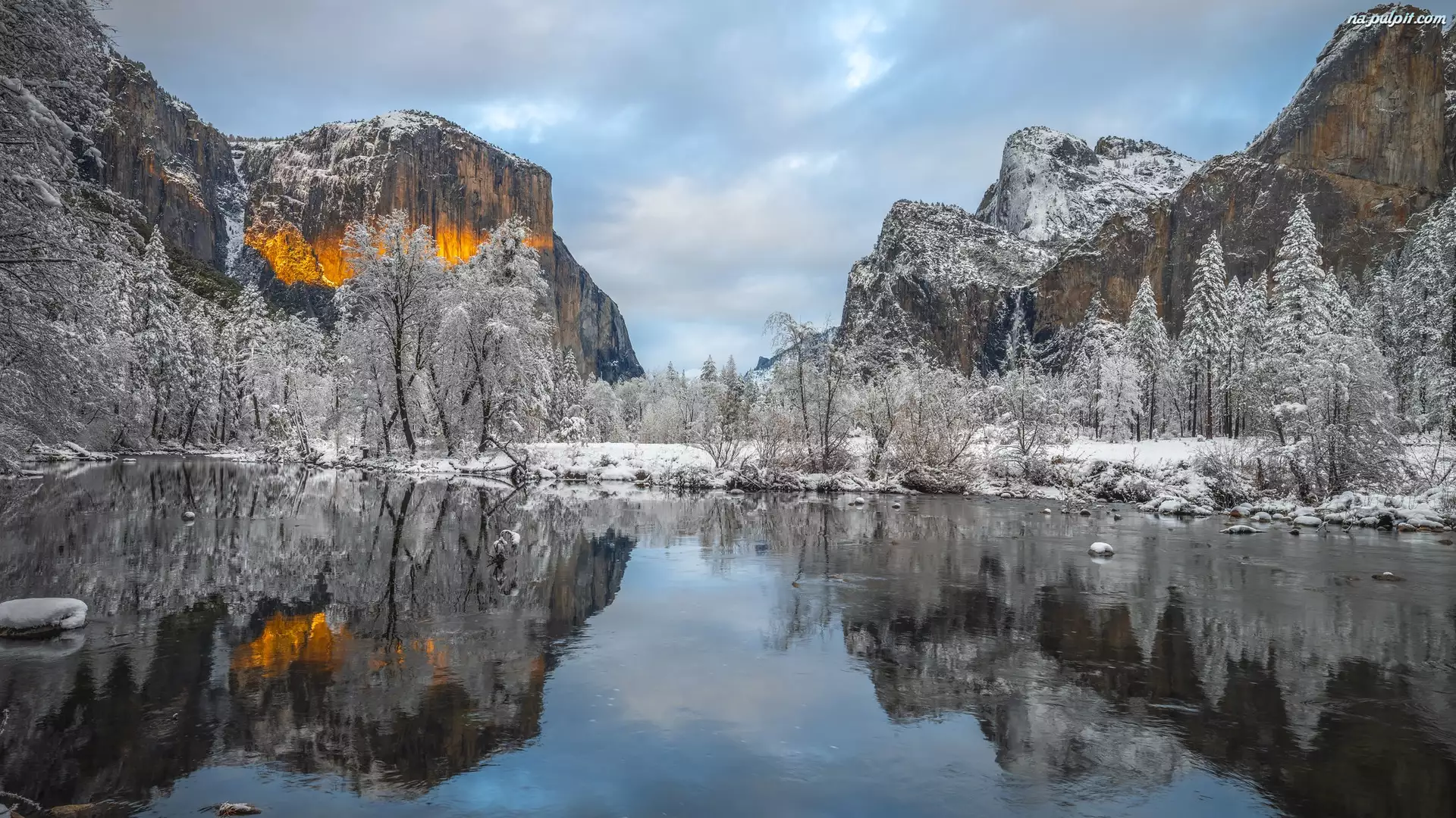 Staby Zjednoczone, Góry, Kalifornia, Drzewa, Park Narodowy Yosemite, Rzeka, Merced River, Zima, Oszronione