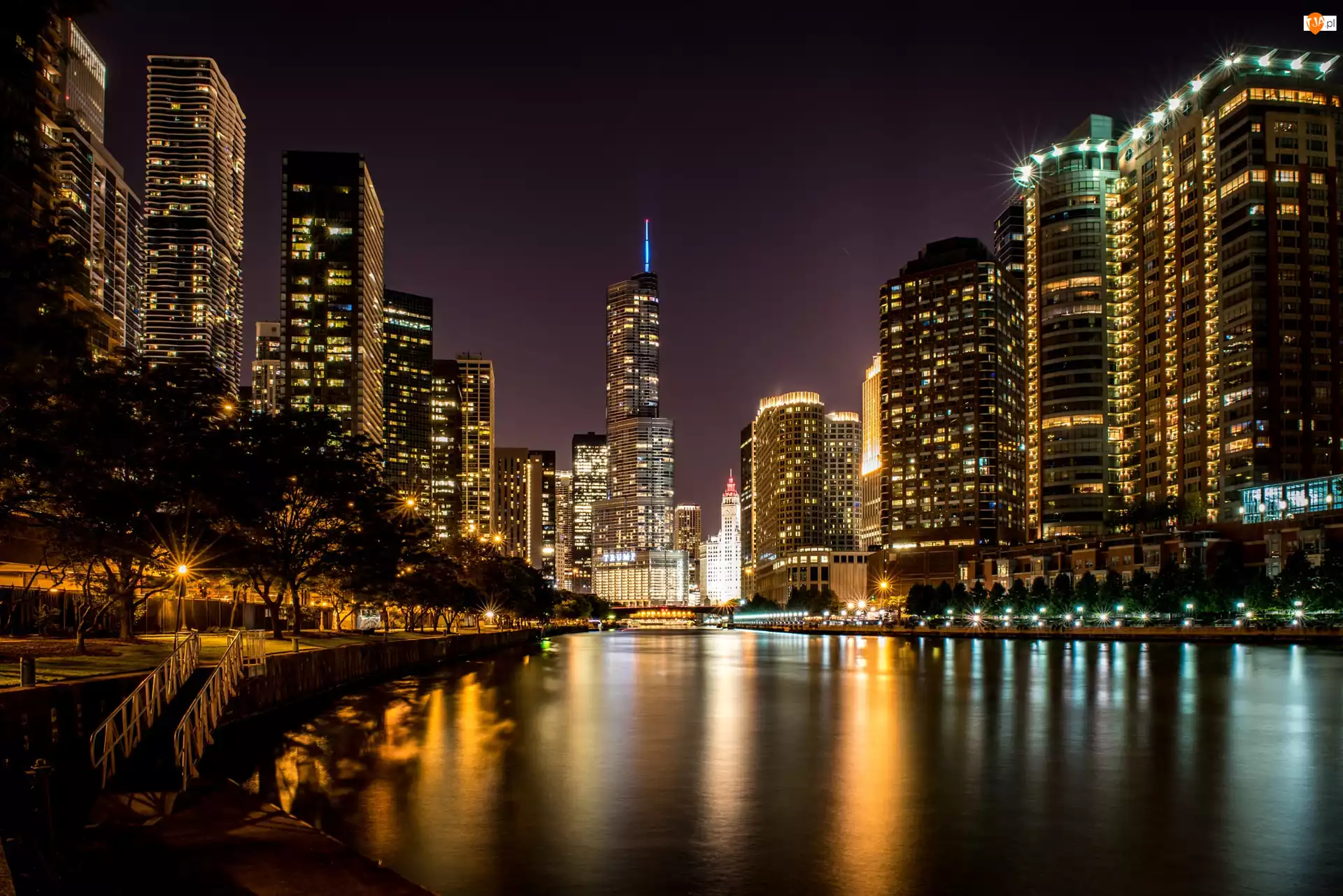 Stan Illinois, Chicago, Willis Tower, Stany Zjednoczone, Wieżowce, Rzeka Chicago, Miasto nocą