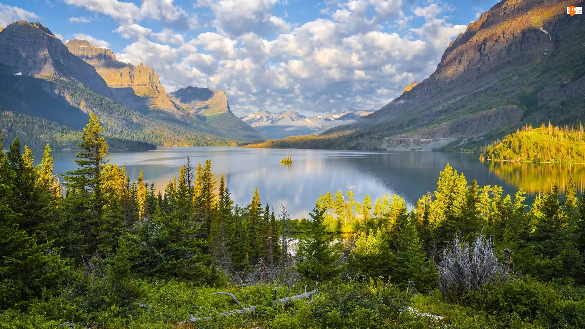 Stan Montana, Park Narodowy Glacier, Drzewa, Stany Zjednoczone, Góry, Saint Mary Lake, Jezioro