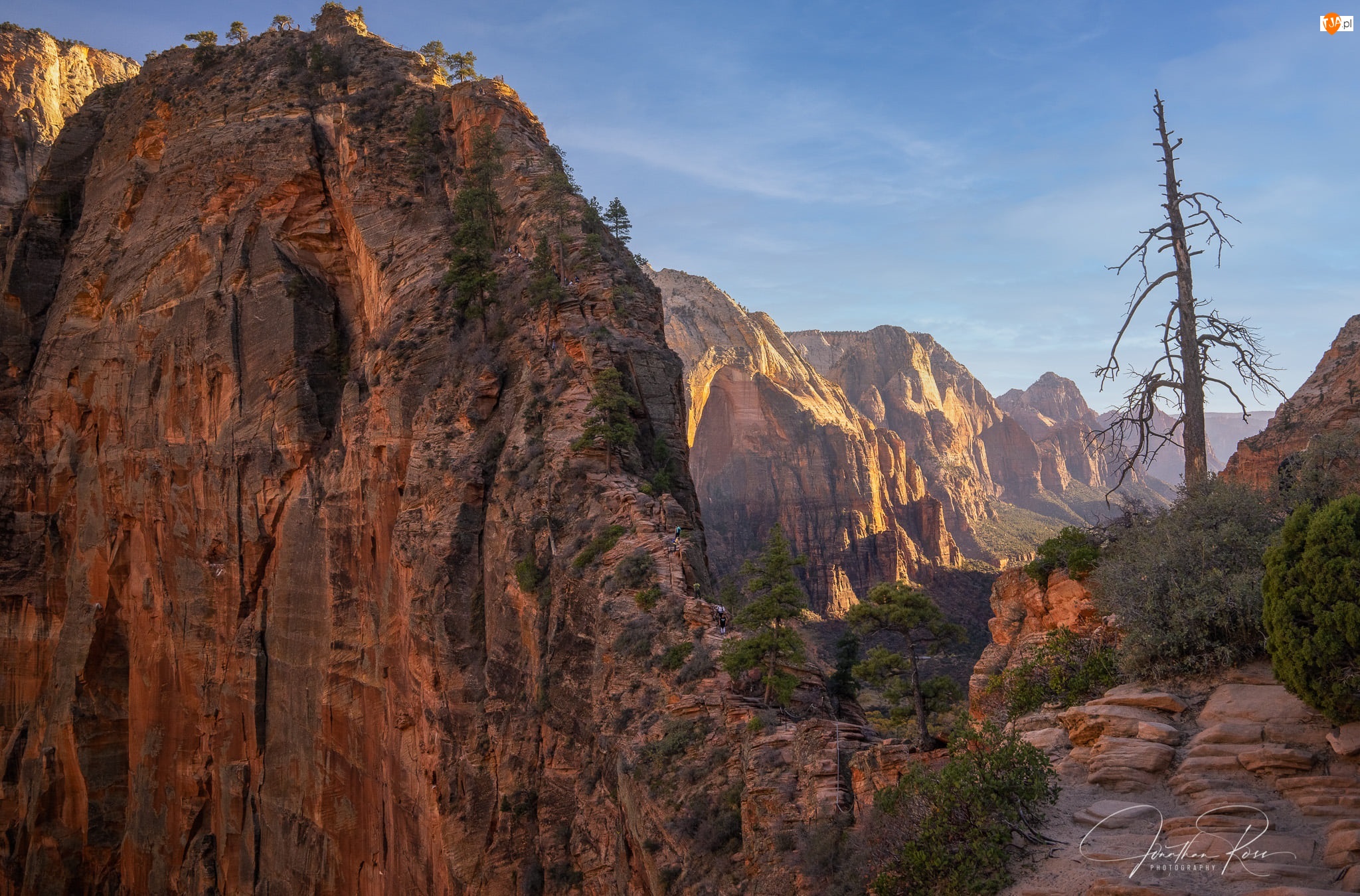 Stan Utah, Park Narodowy Zion, Góry, Drzewa, Stany Zjednoczone, Skały