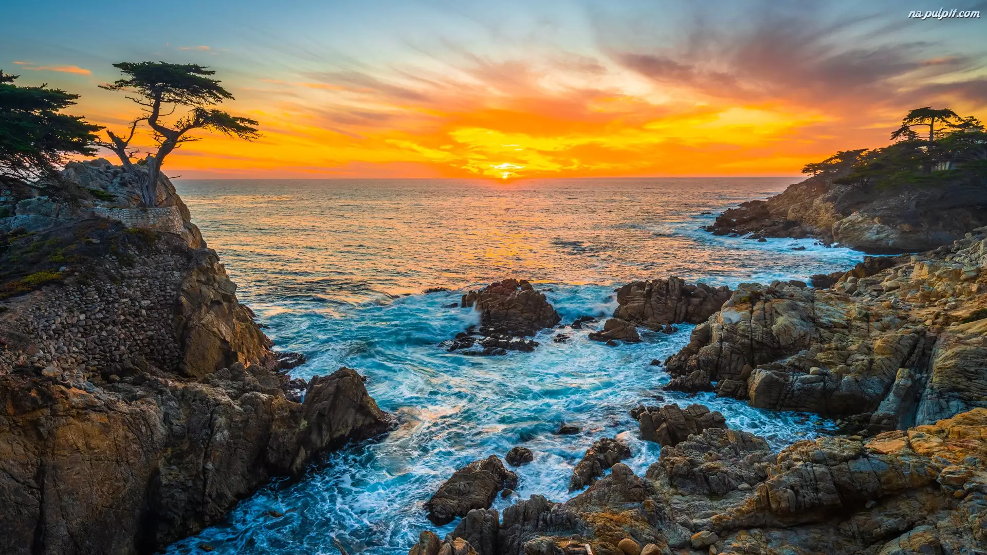 Stany Zjednoczone, Zatoka, Carmel Bay, Pebble Beach, Atrakcja Lone Cypress, Cyprys wielkoszyszkowy, Morze, Skała, Zachód słońca, Kalifornia