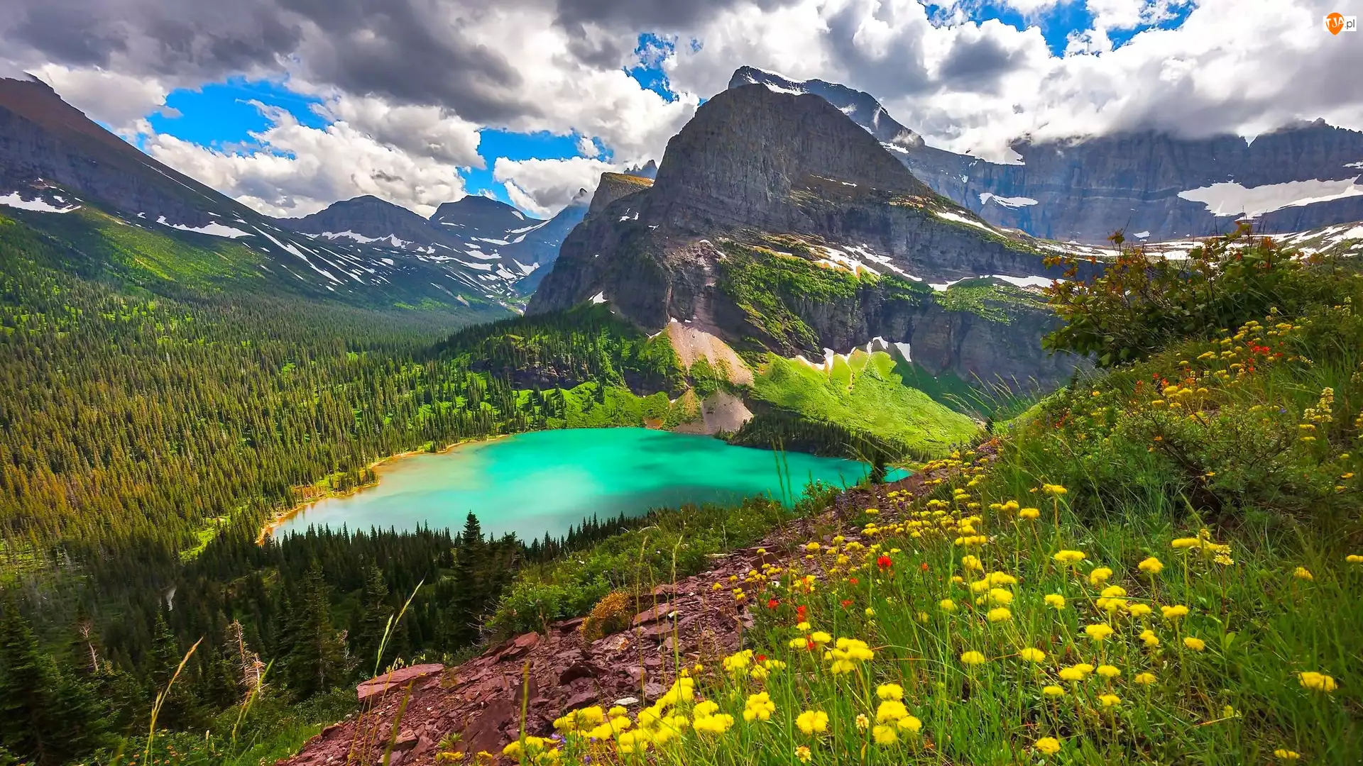 Stany Zjednoczone, Chmury, Park Narodowy Glacier, Las, Jezioro, Góry, Kwiaty, Grinnell Lake, Drzewa, Montana