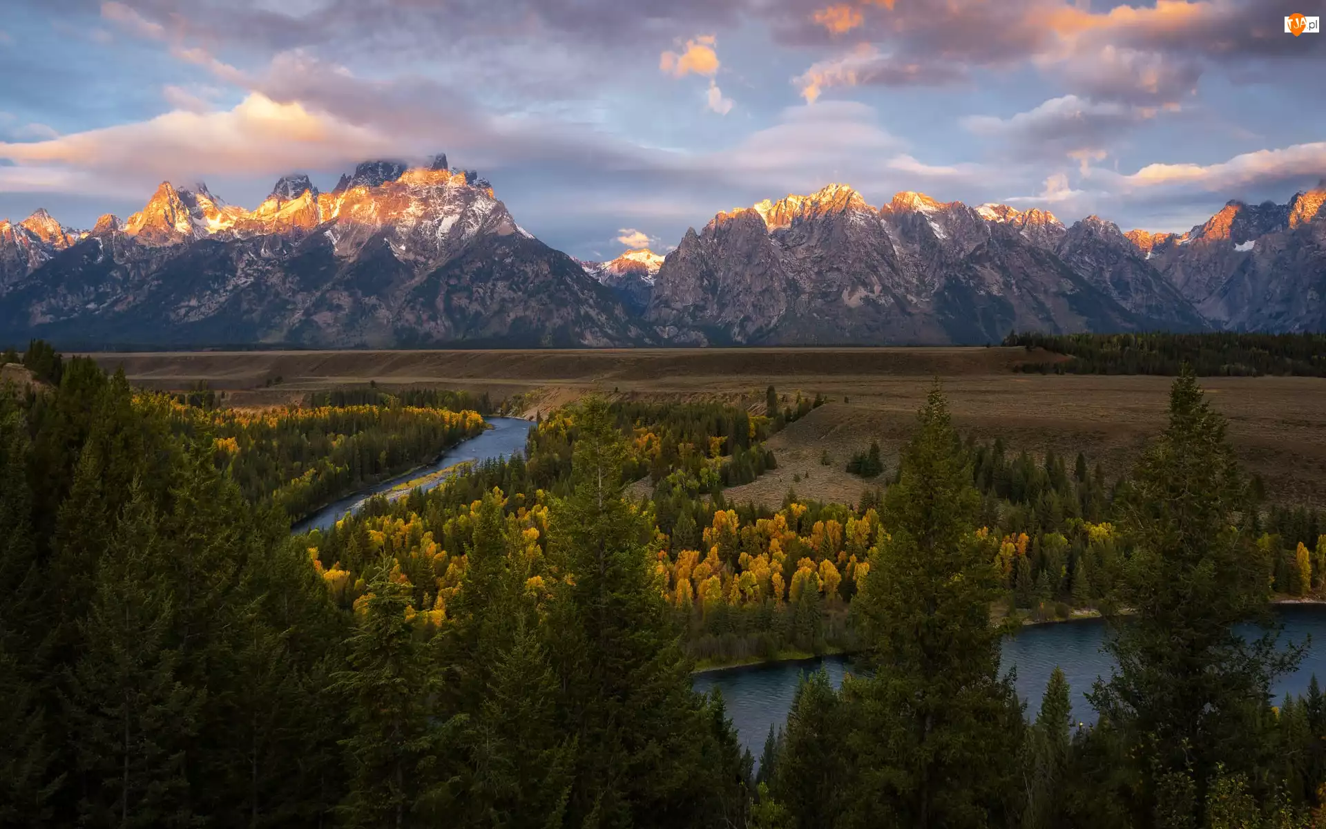 Stany Zjednoczone, Chmury, Park Narodowy Grand Teton, Jesień, Teton Range, Góry, Snake River, Rzeka, Drzewa, Wyoming