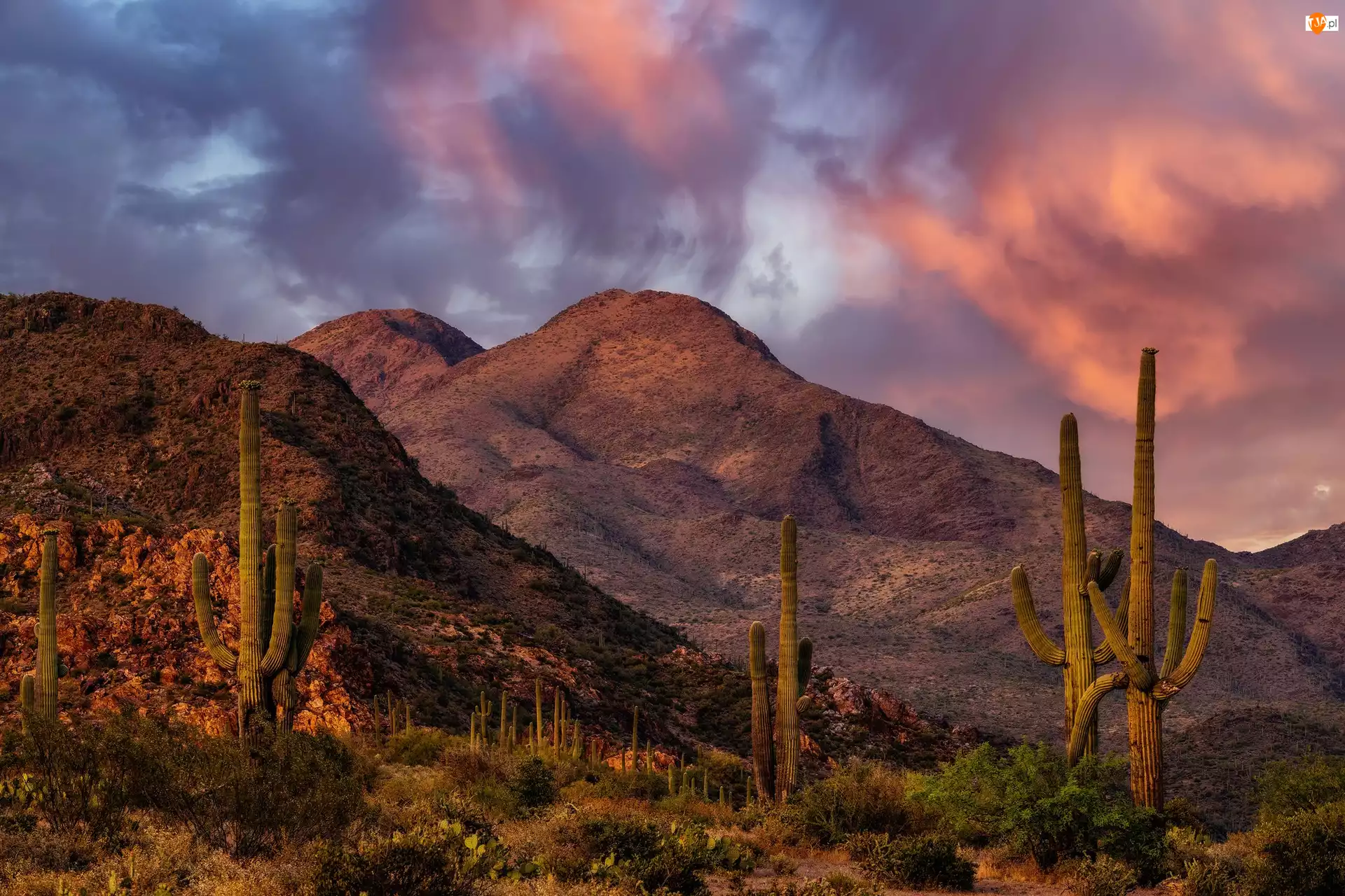 Stany Zjednoczone, Chmury, Park Narodowy Saguaro, Saguaro, Góry, Zachód słońca, Sonora, Pustynia, Kaktusy, Arizona