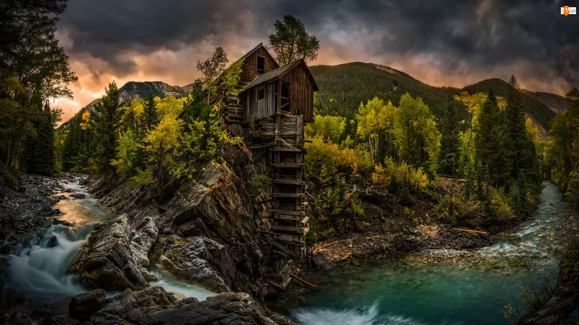 Stany Zjednoczone, Ciemne, Chmury, Drzewa, Crystal Mill, Młyn, Crystal River, Rzeka, Skały, Kolorado
