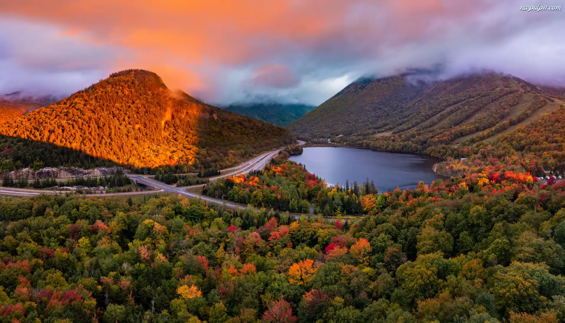 Stany Zjednoczone, Drzewa, Droga, Lasy, Jezioro, Jesień, Góry, Echo Lake, White Mountains, Stan New Hampshire