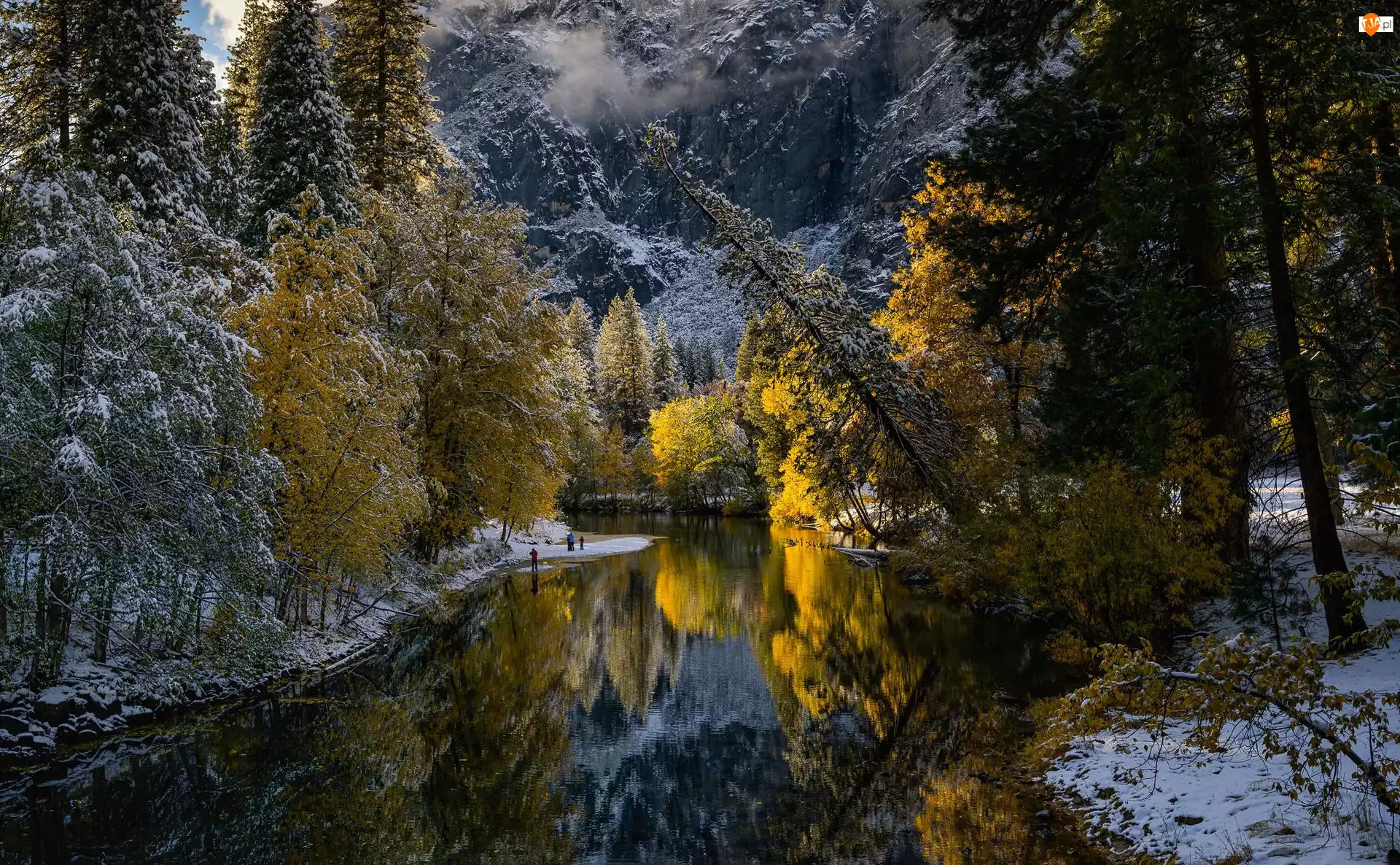 Stany Zjednoczone, Drzewa, Stan Kalifornia, Śnieg, Góry, Rzeka, Merced River, Jesień, Park Narodowy Yosemite