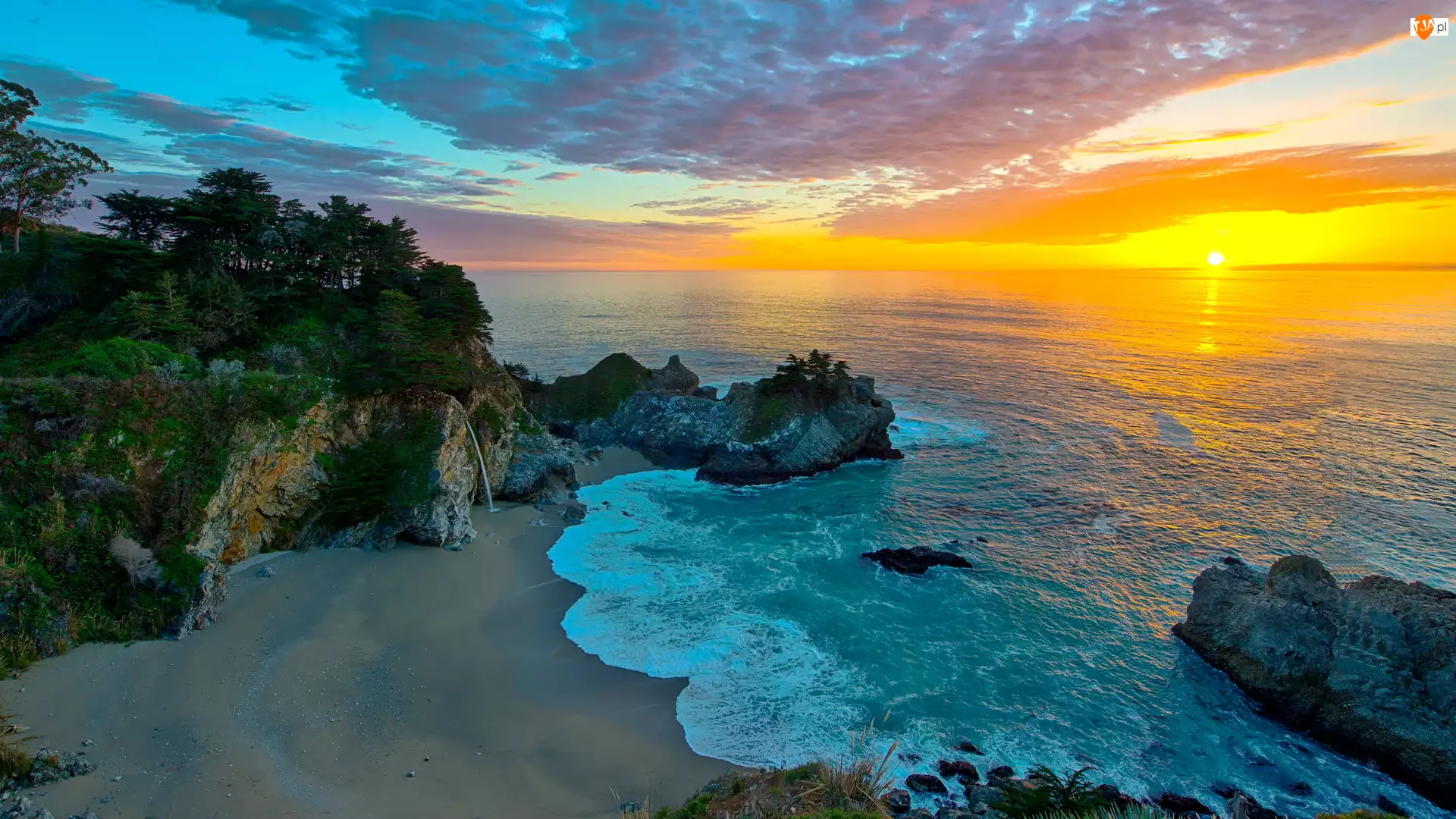 Stany Zjednoczone, Drzewa, Zachód słońca, Skały, Julii Pfeiffer Burns, Park stanowy, Wodospad McWay, Zatoka, Morze, Kalifornia