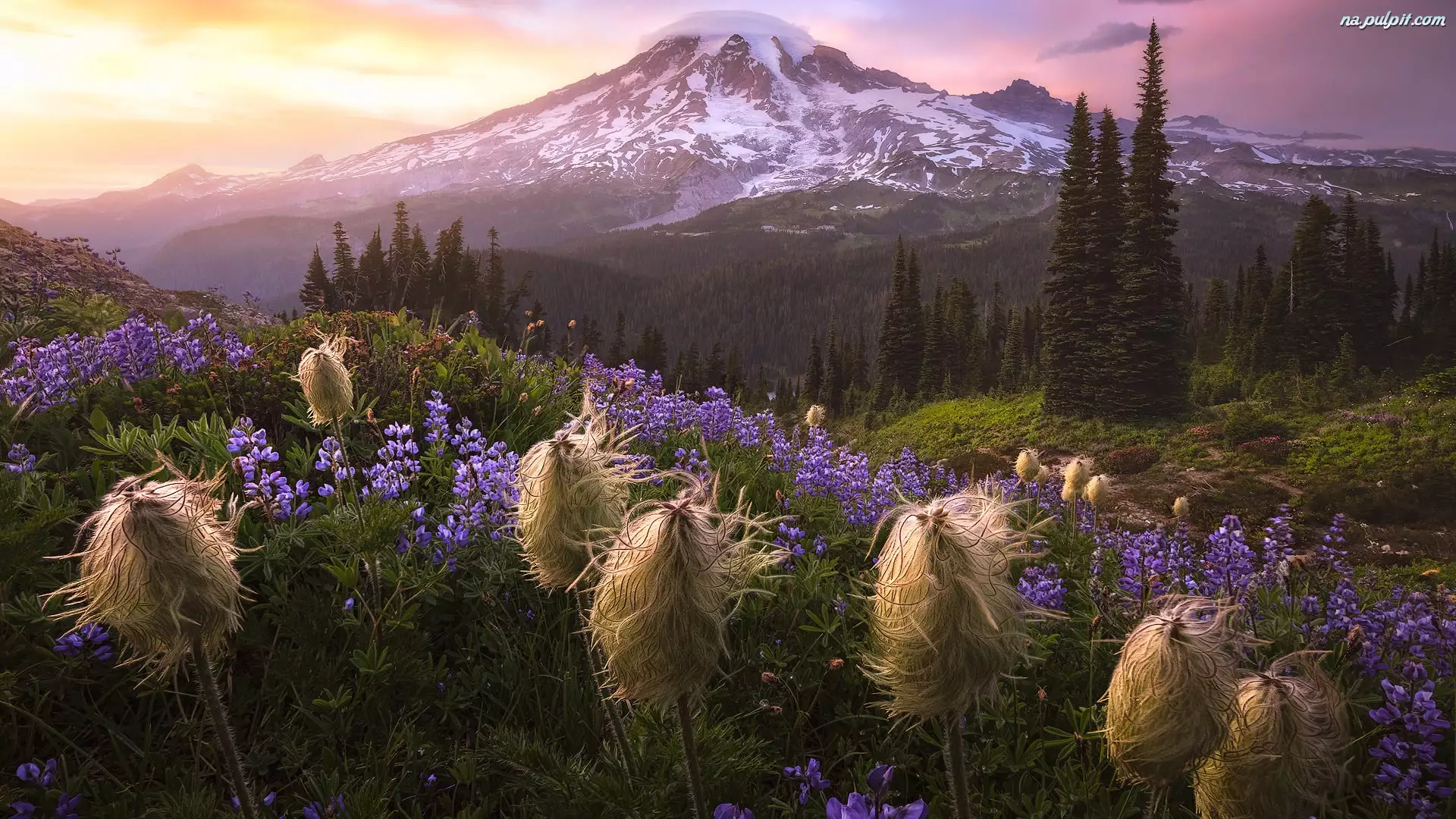 Stany Zjednoczone, Góry, Stan Waszyngton, Miądrzyga, Łąka, Stratowulkan Mount Rainier, Drzewa, Park Narodowy Mount Rainier, Łubin