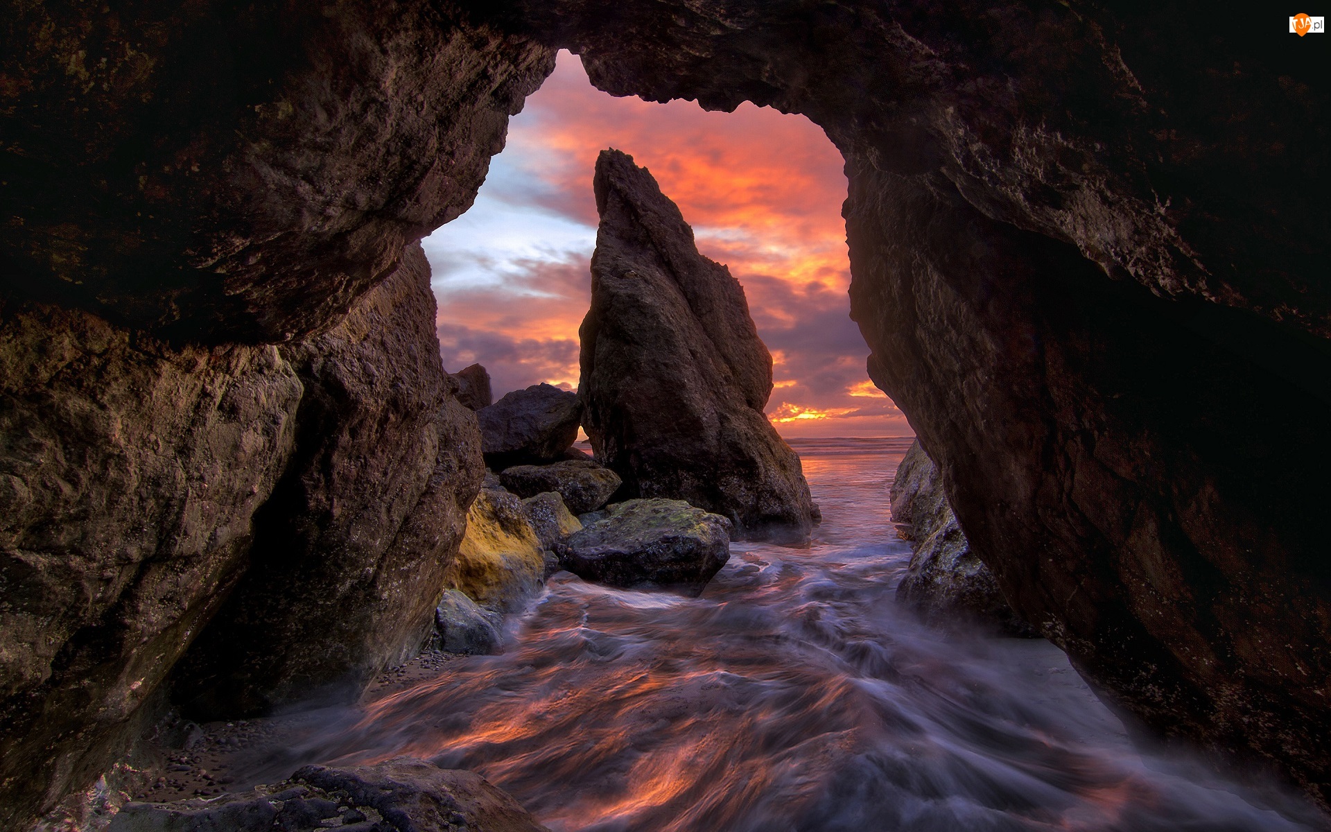 Stany Zjednoczone, Jaskinia, Stan Waszyngton, Plaża Ruby Beach, Park Narodowy Olympic, Skały, Morze, Zachód słońca, Kamienie