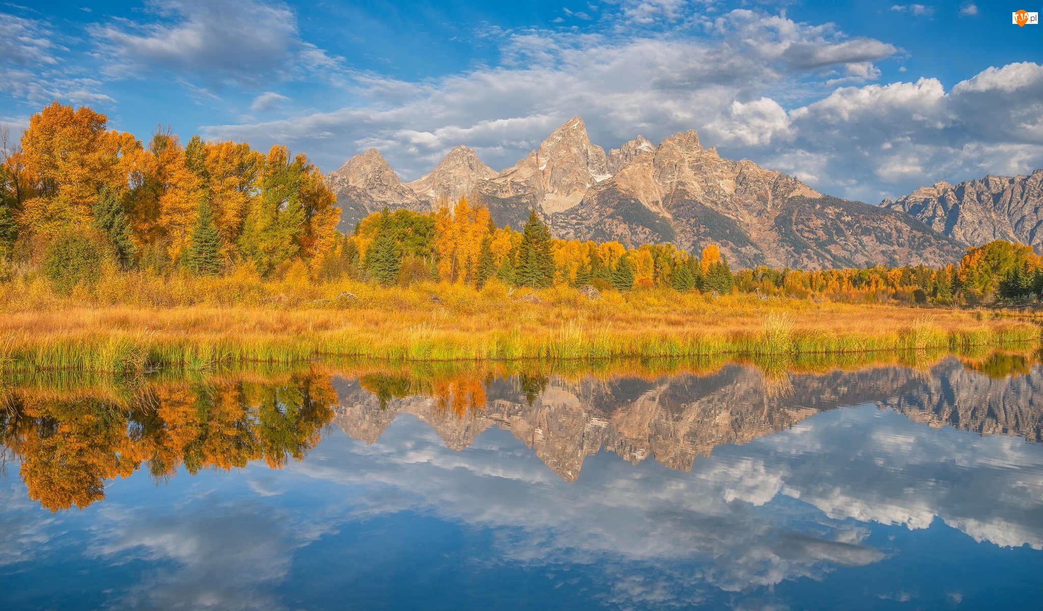 Stany Zjednoczone, Jesień, Chmury, Drzewa, Rzeka, Park Narodowy Grand Teton, Góry, Snake River, Teton Range, Stan Wyoming