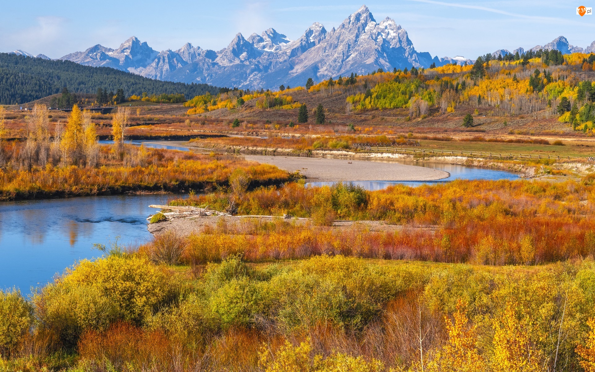 Stany Zjednoczone, Jesień, Rzeka Snake River, Krzewy, Góry, Park Narodowy Grand Teton, Las, Teton Range, Drzewa, Stan Wyoming