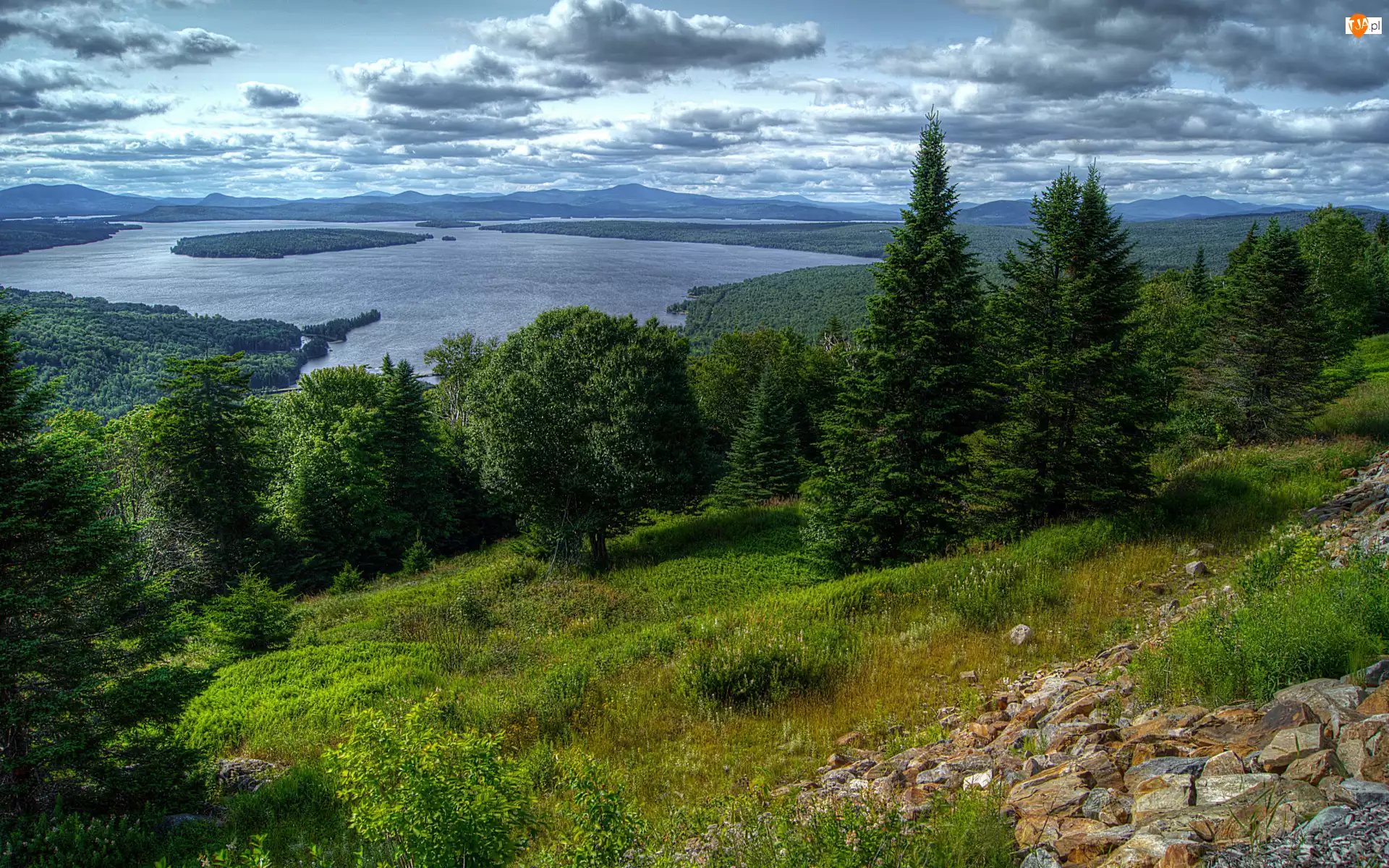 Stany Zjednoczone, Jezioro, Mooselookmeguntic Lake, Rośliny, Las, Chmury, Kamienie, Drzewa, Stok, Stan Maine