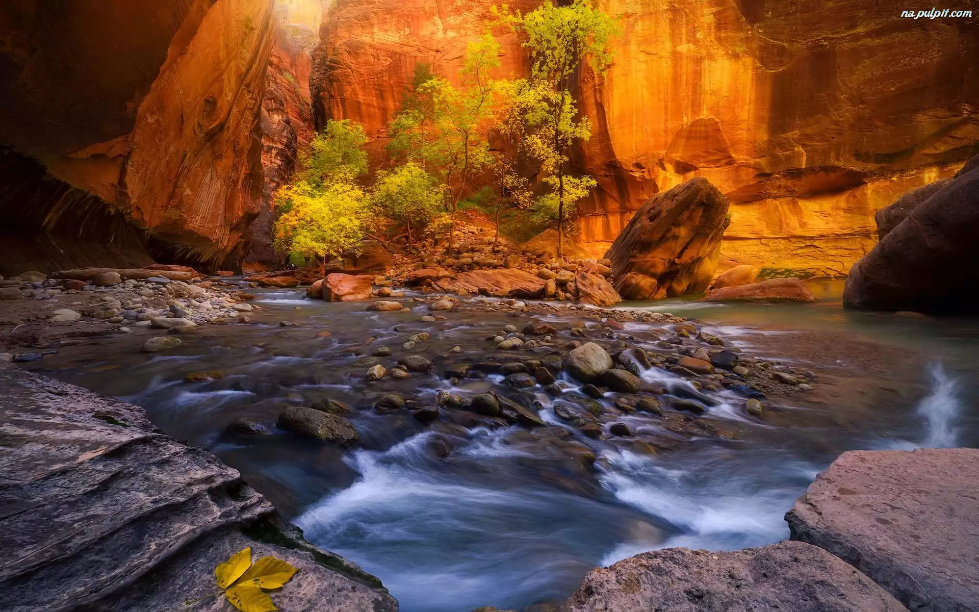Stany Zjednoczone, Kanion Zion Narrows, Stan Utah, Virgin River, Drzewa, Skały, Kamienie, Park Narodowy Zion, Rzeka