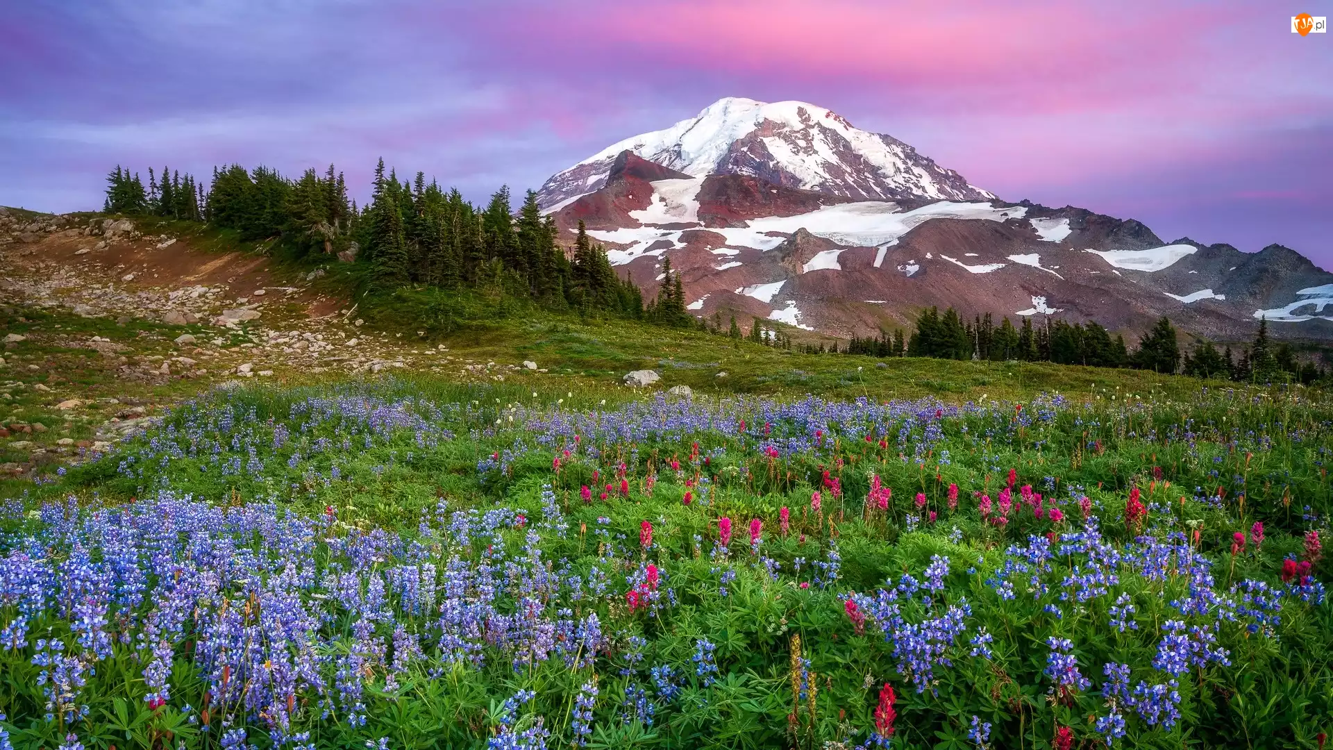 Stany Zjednoczone, Łąka, Stan Waszyngton, Mount Rainier, Park Narodowy Mount Rainier, Łubin, Drzewa, Góry, Stratowulkan