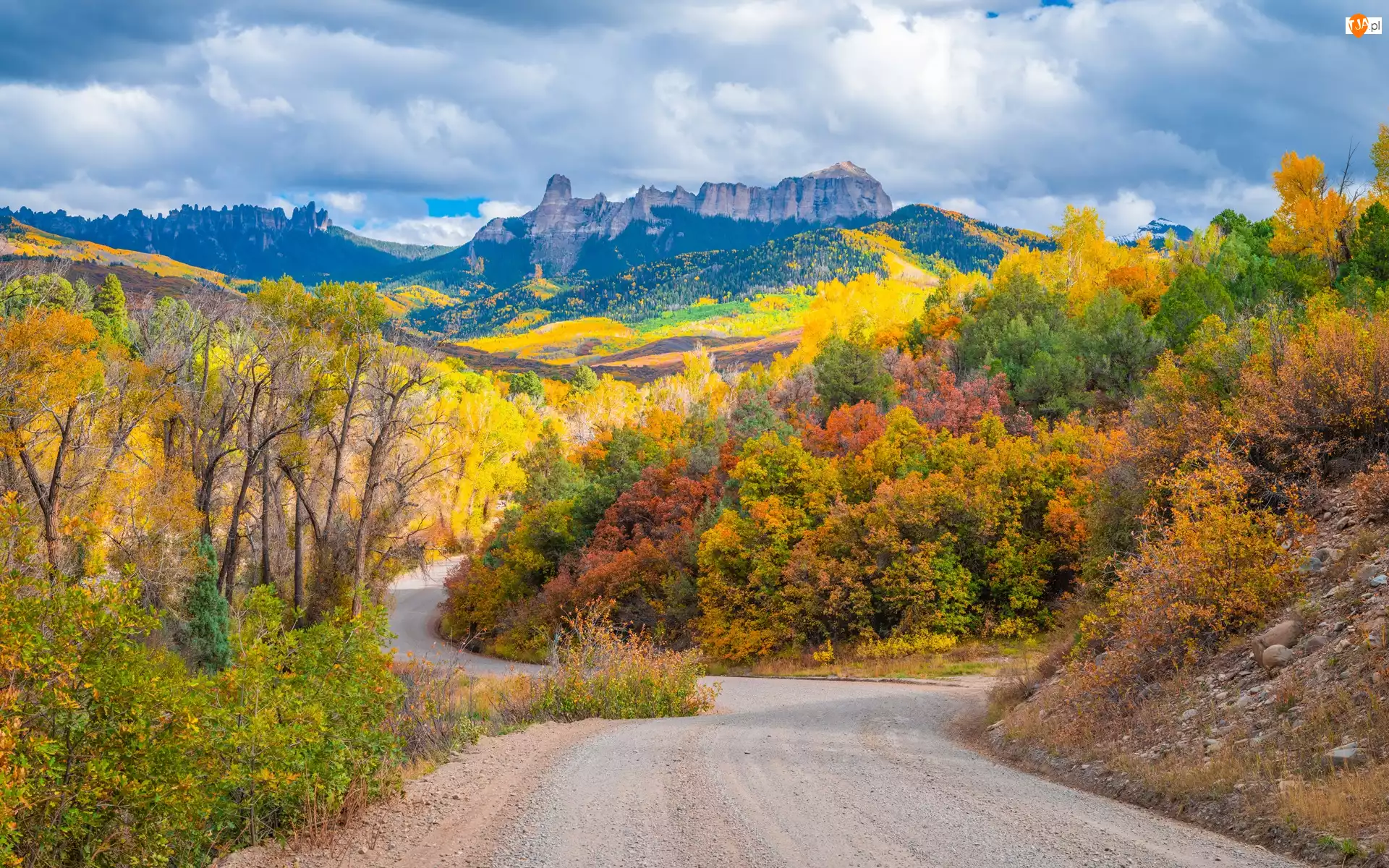 Stany Zjednoczone, Las, Kolorado, Chmury, Owl Creek Pass, Drzewa, Góry, Jesień, Droga