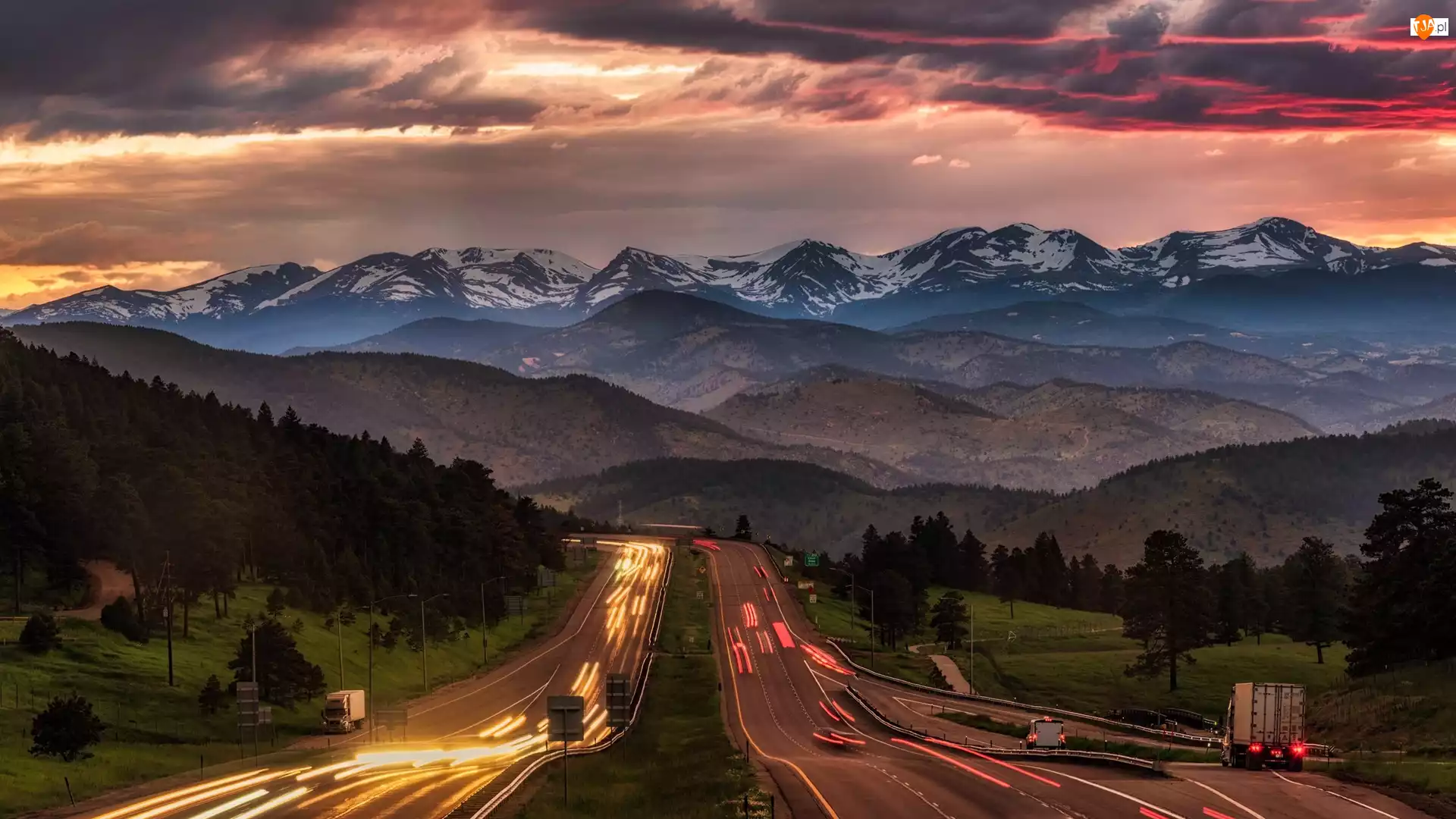 Stany Zjednoczone, Las, Kolorado, Zachód słońca, Chmury, Drzewa, Droga, Góry Skaliste, Światła