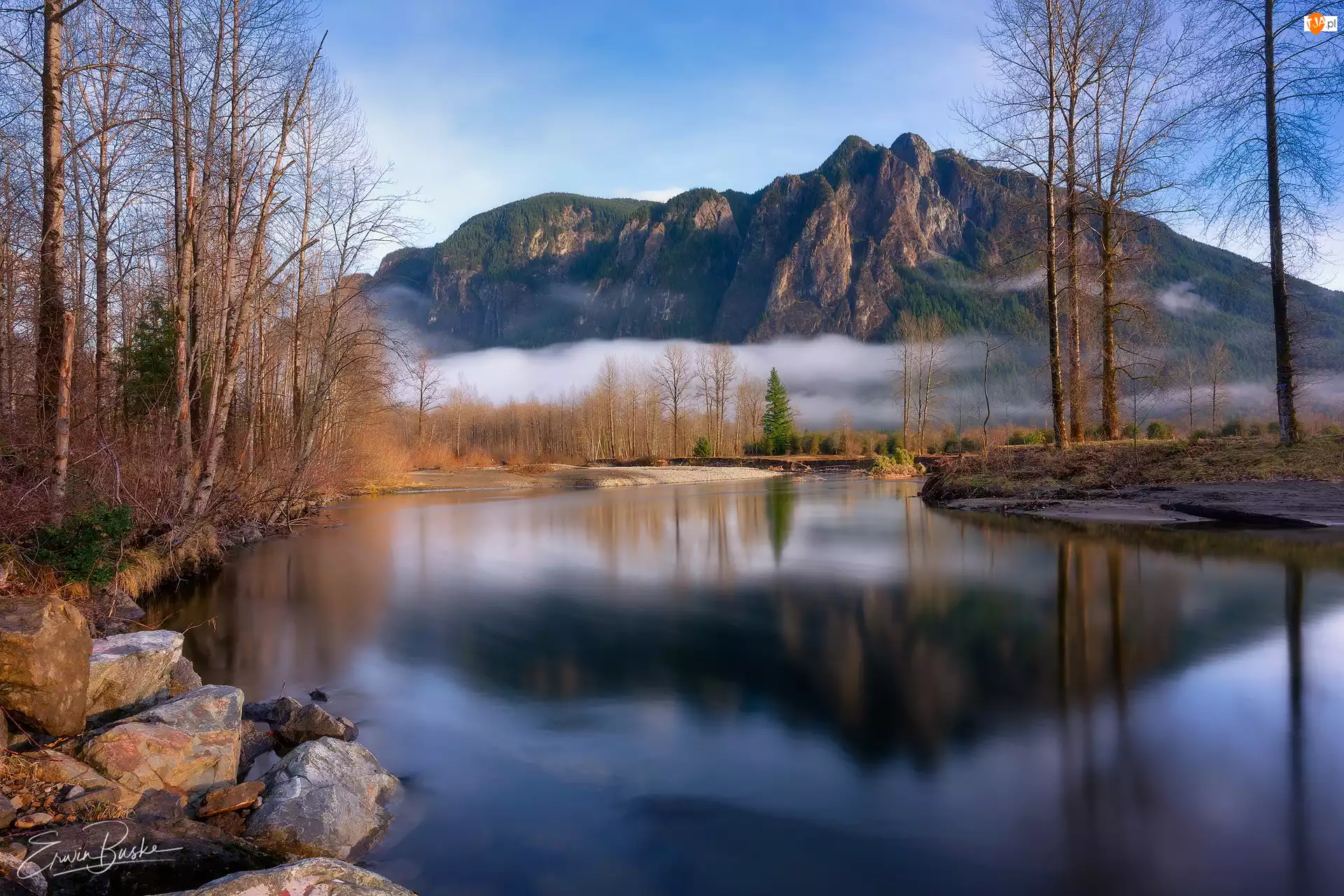 Stany Zjednoczone, Lazy River, Stan Waszyngton, Bezlistne, Drzewa, Góra, Mount Si, Rzeka, Jesień
