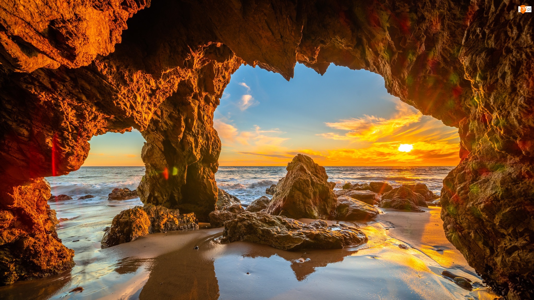 Stany Zjednoczone, Malibu, Hrabstwo Los Angeles, Zachód słońca, Skały, Jaskinia, Plaża, Morze, El Matador Beach, Kalifornia