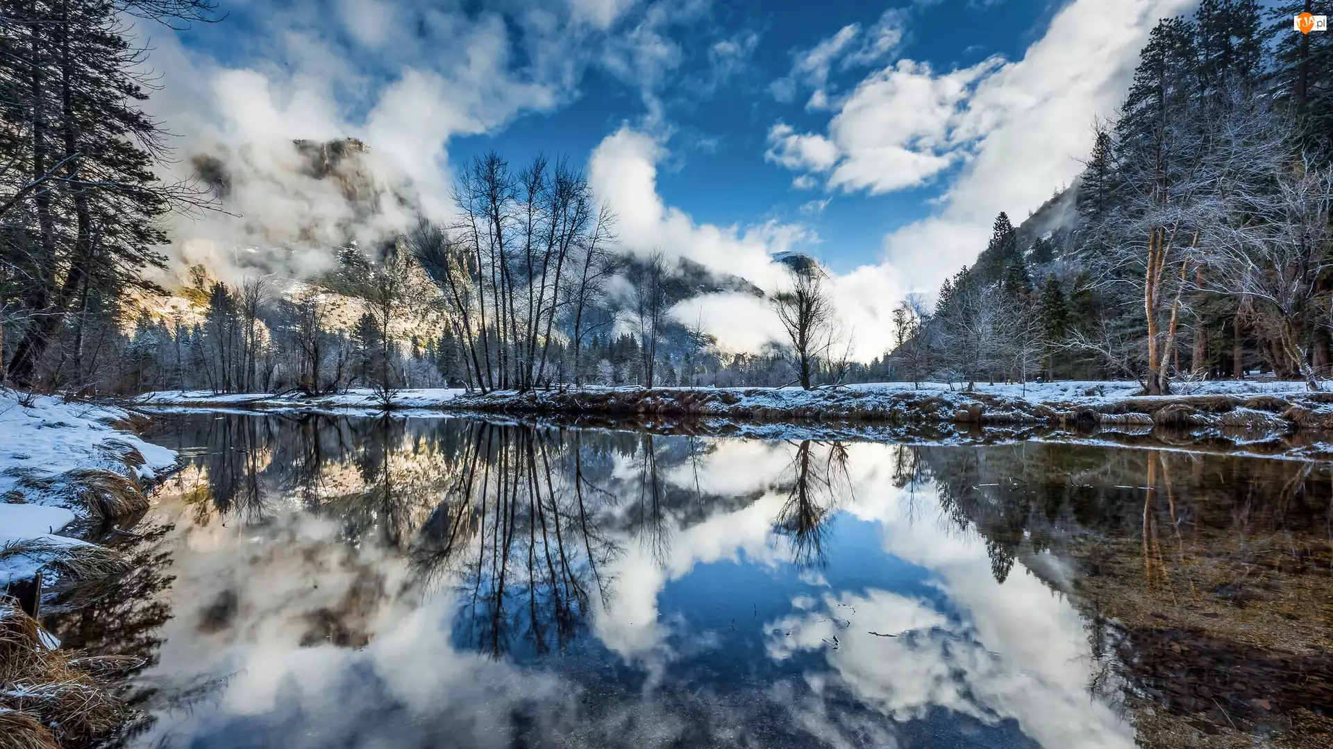 Stany Zjednoczone, Merced River, Kalifornia, Śnieg, Park Narodowy Yosemite, Góry, Drzewa, Rzeka, Odbicie