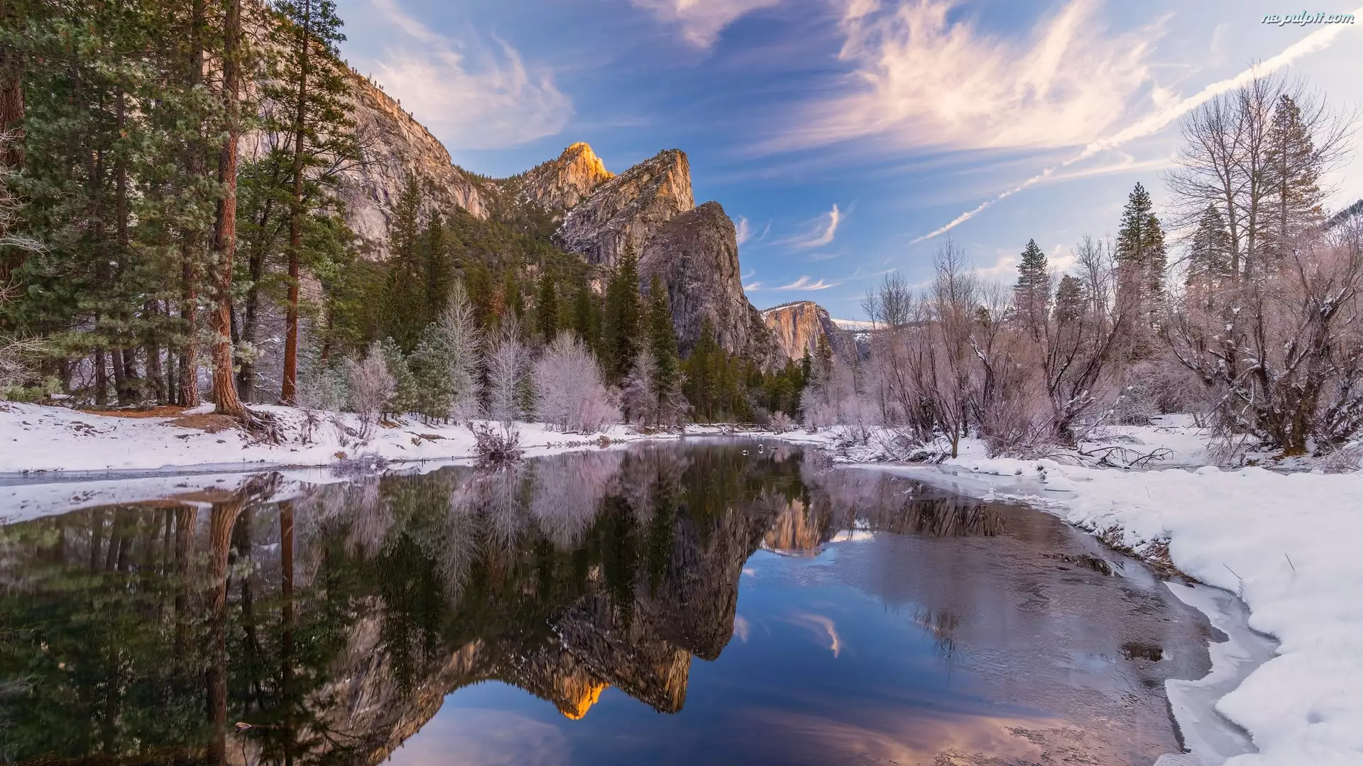 Stany Zjednoczone, Odbicie, Park Narodowy Yosemite, Drzewa, Góry, Zima, Merced River, Rzeka, Śnieg, Kalifornia
