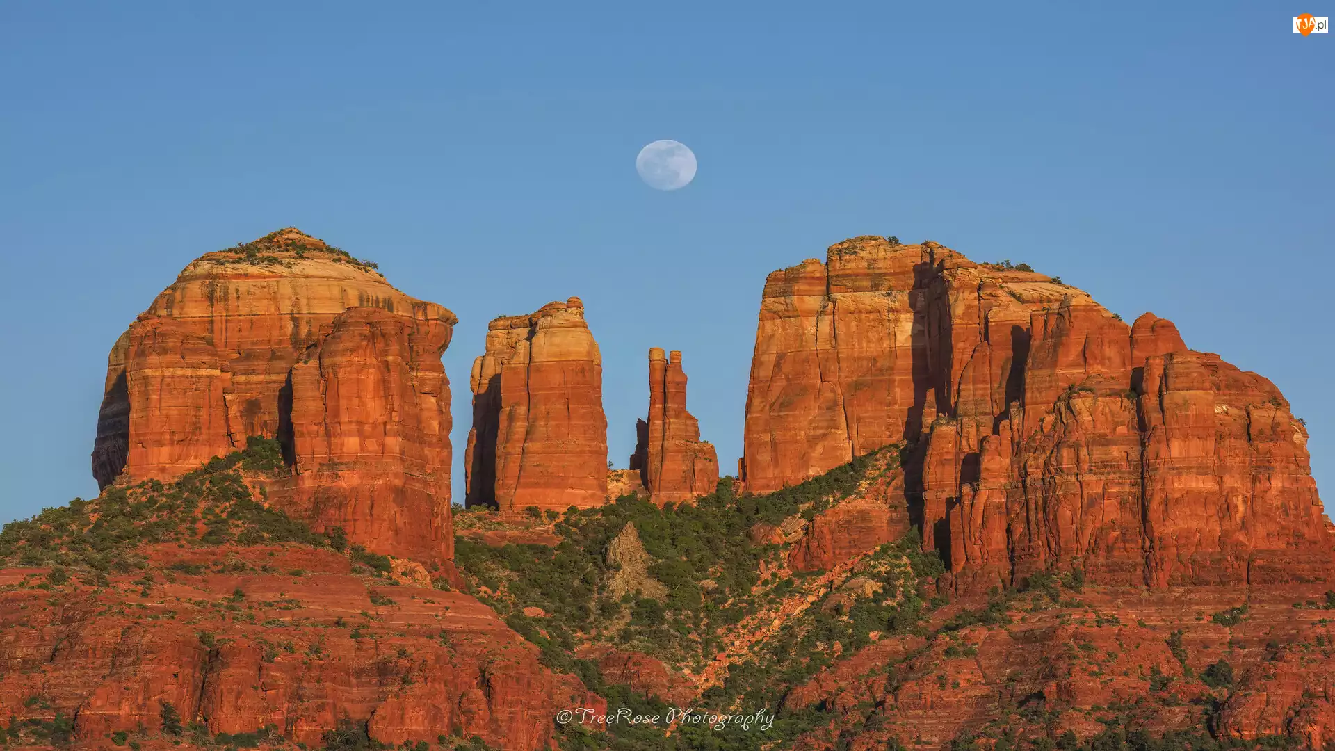Stany Zjednoczone, Wschód słońca, Arizona, Cathedral Rocks, Sedona, Czerwone, Skały, Księżyc, Krzewy