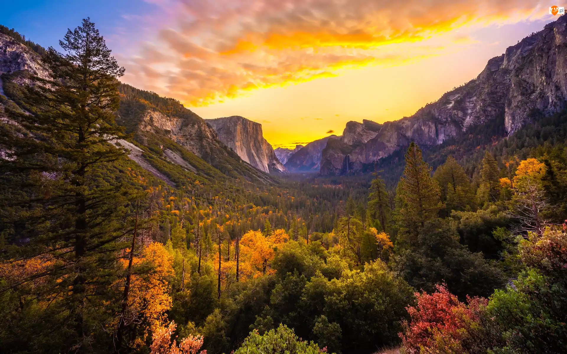 Stany Zjednoczone, Yosemite Valley, Park Narodowy Yosemite, Dolina, Jesień, Wschód słońca, Krzewy, Drzewa, Góry, Kalifornia