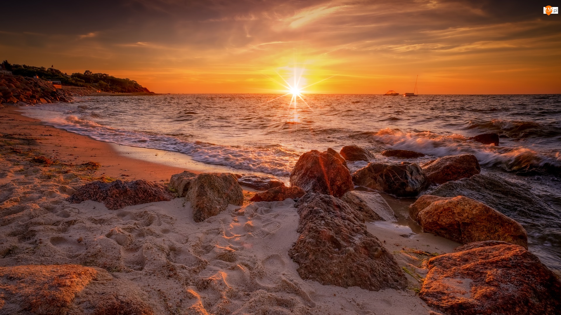Stany Zjednoczone, Zachód słońca, Brewster, Piasek, Fale, Morze, Plaża, Kamienie, Breakwater Beach, Massachusetts
