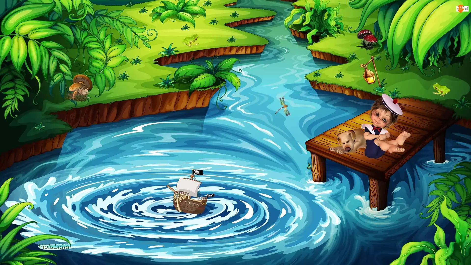 Rzeka, Statek, Laleczka, Grafika, Zabawka