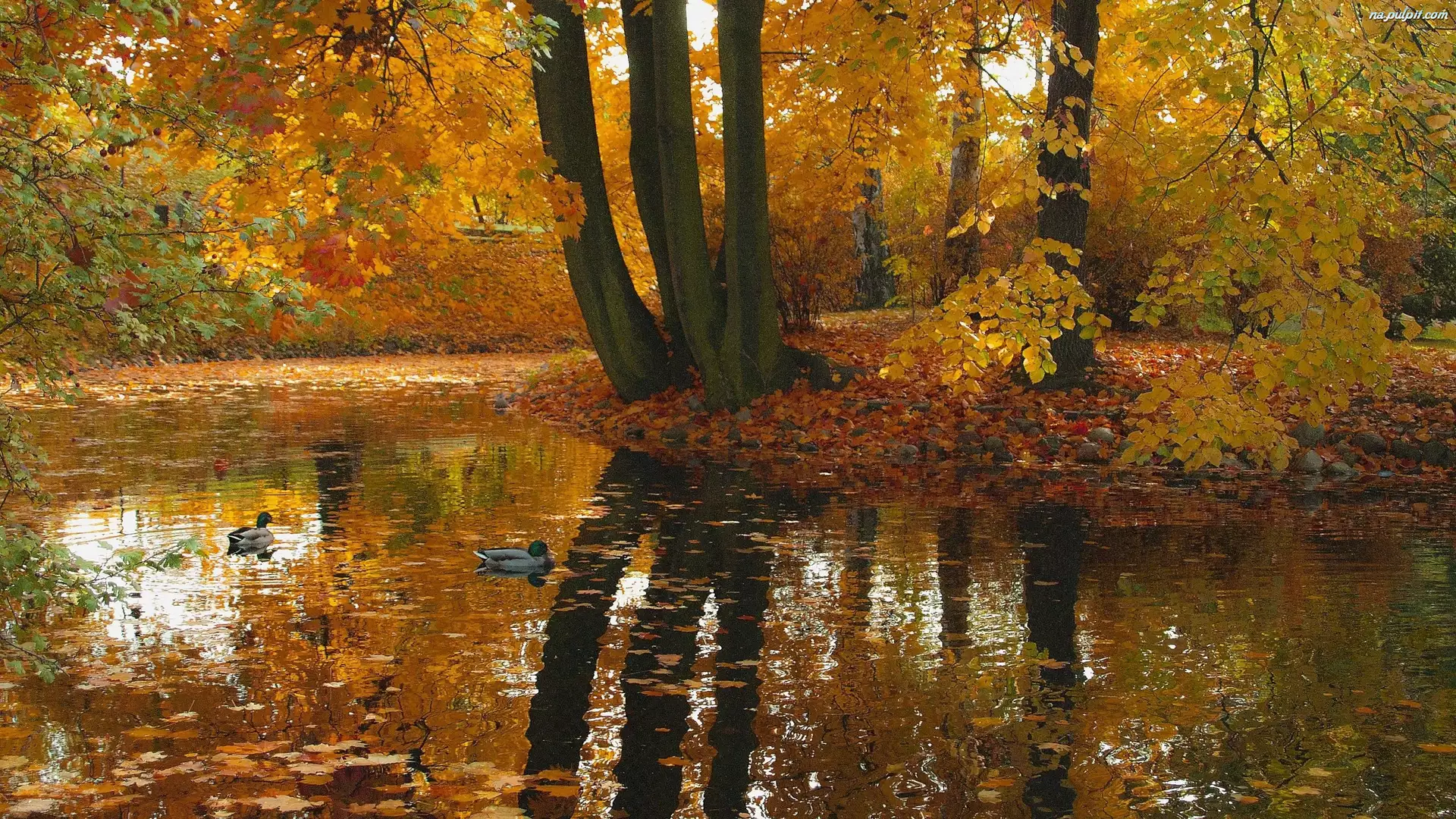Staw, Jesień, Drzewa, Odbicie, Kaczki
