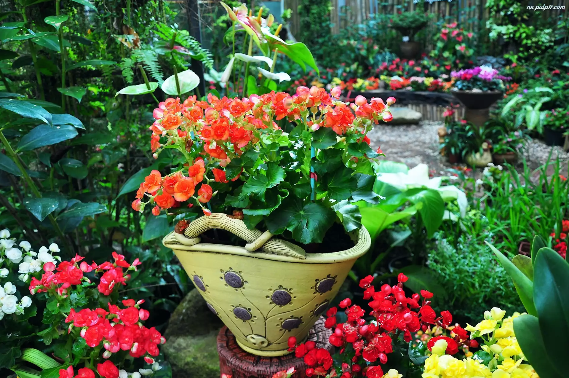 Staw, Kwiaty, Waza, Begonie, Ogród