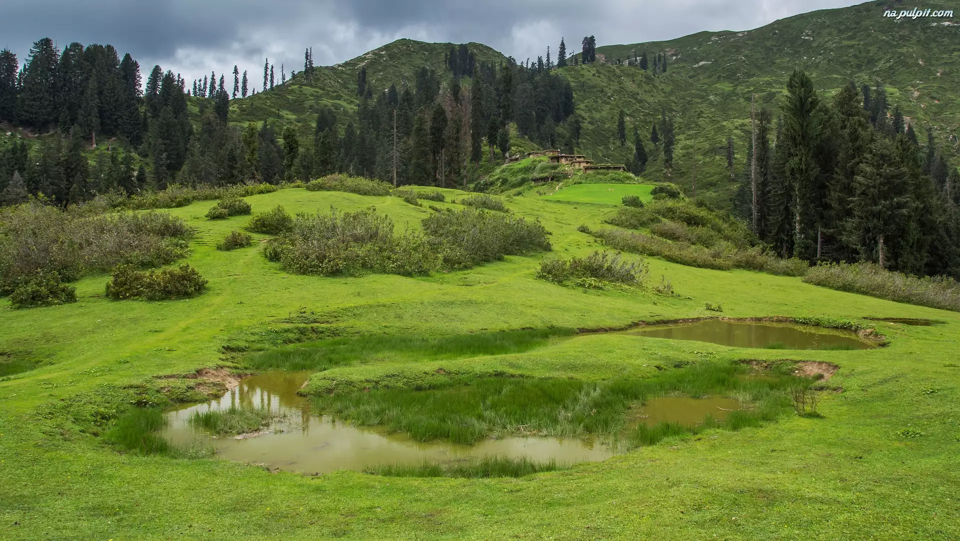 Staw, Wzgórza, Drzewa, Roślinność, Polana, Zieleń