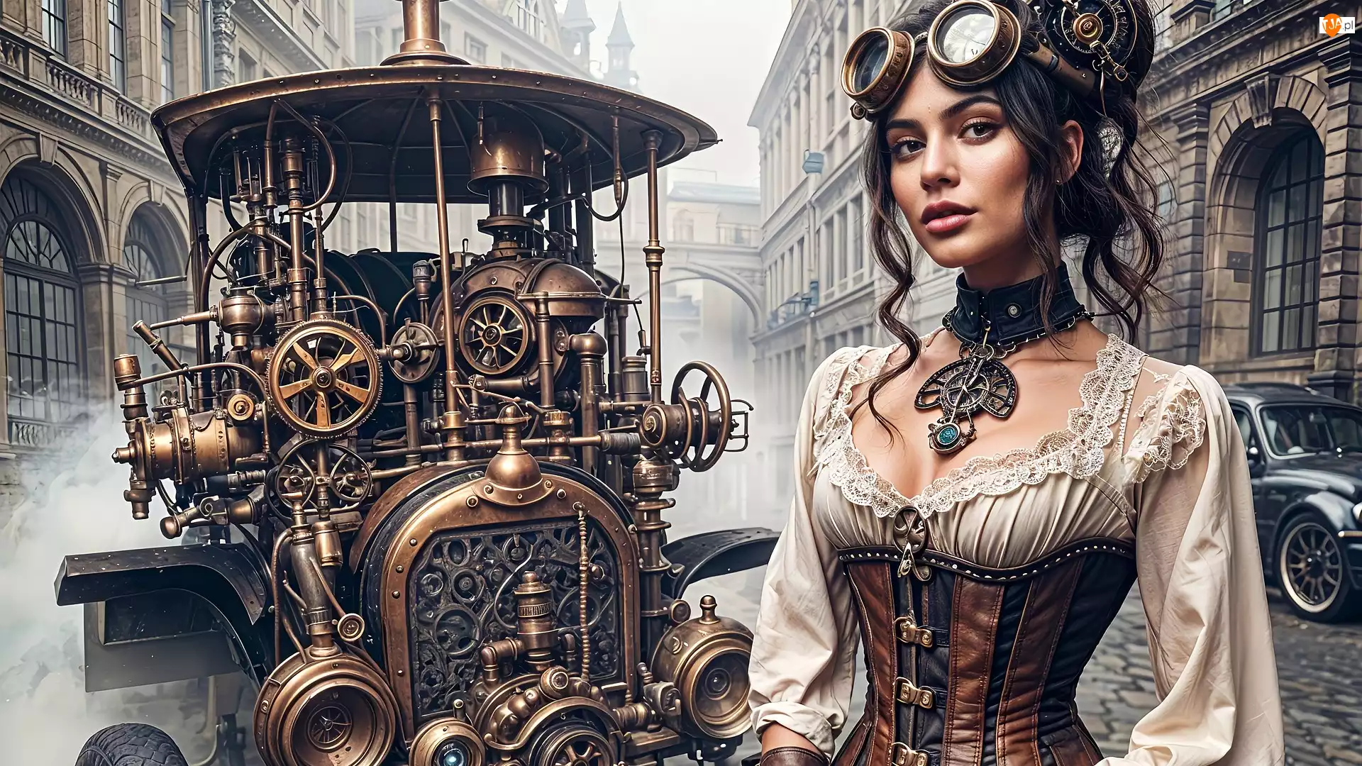 Steampunk, Kobieta, Kamienice, Fantasy, Domy, Samochód