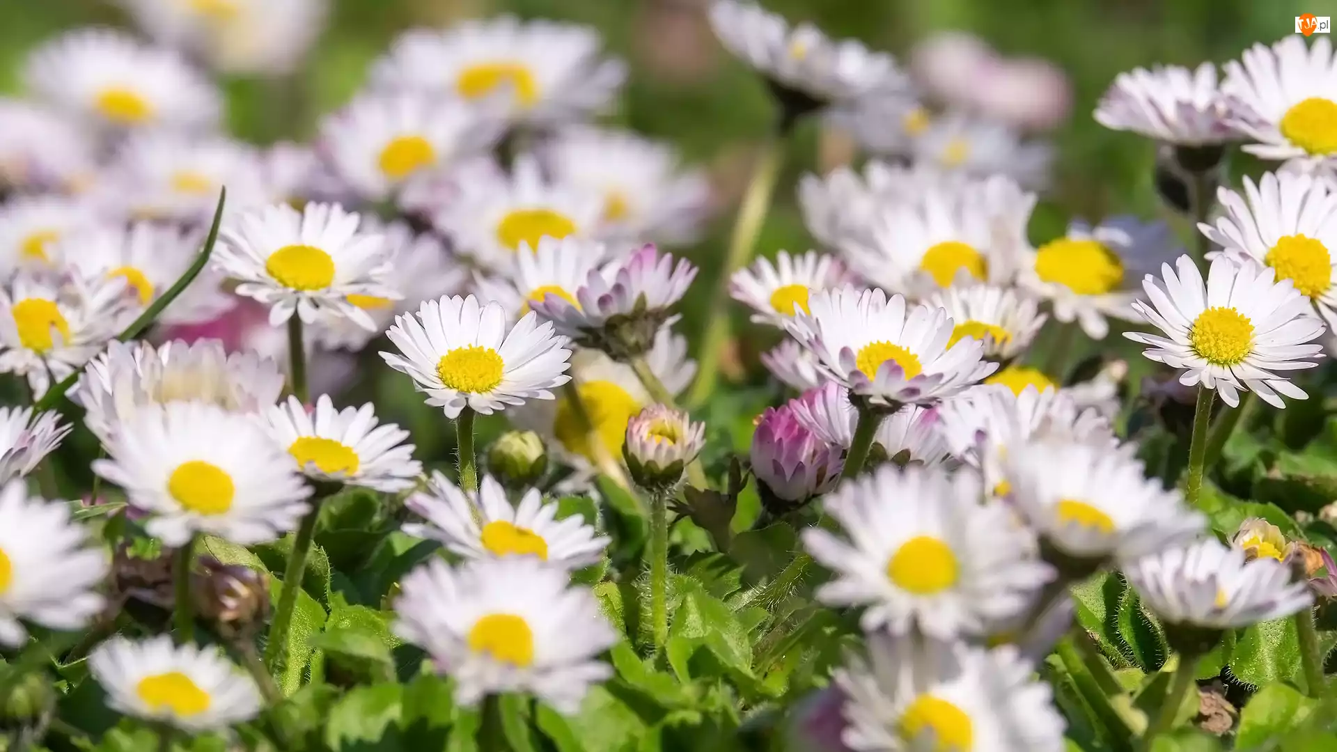 Zbliżenie, Kwiaty, Margerytki, Trawa