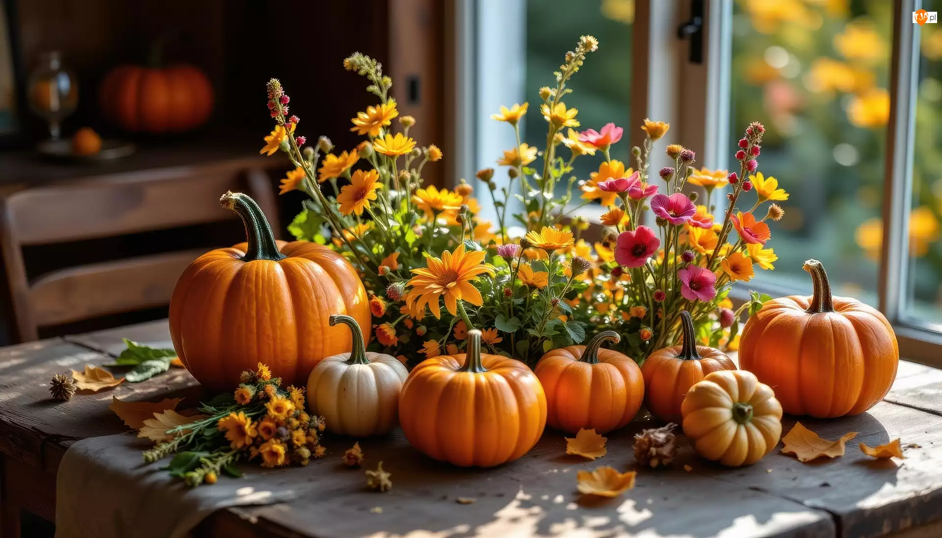 Stół, Grafika AI, Kwiaty, Dynie, Okno