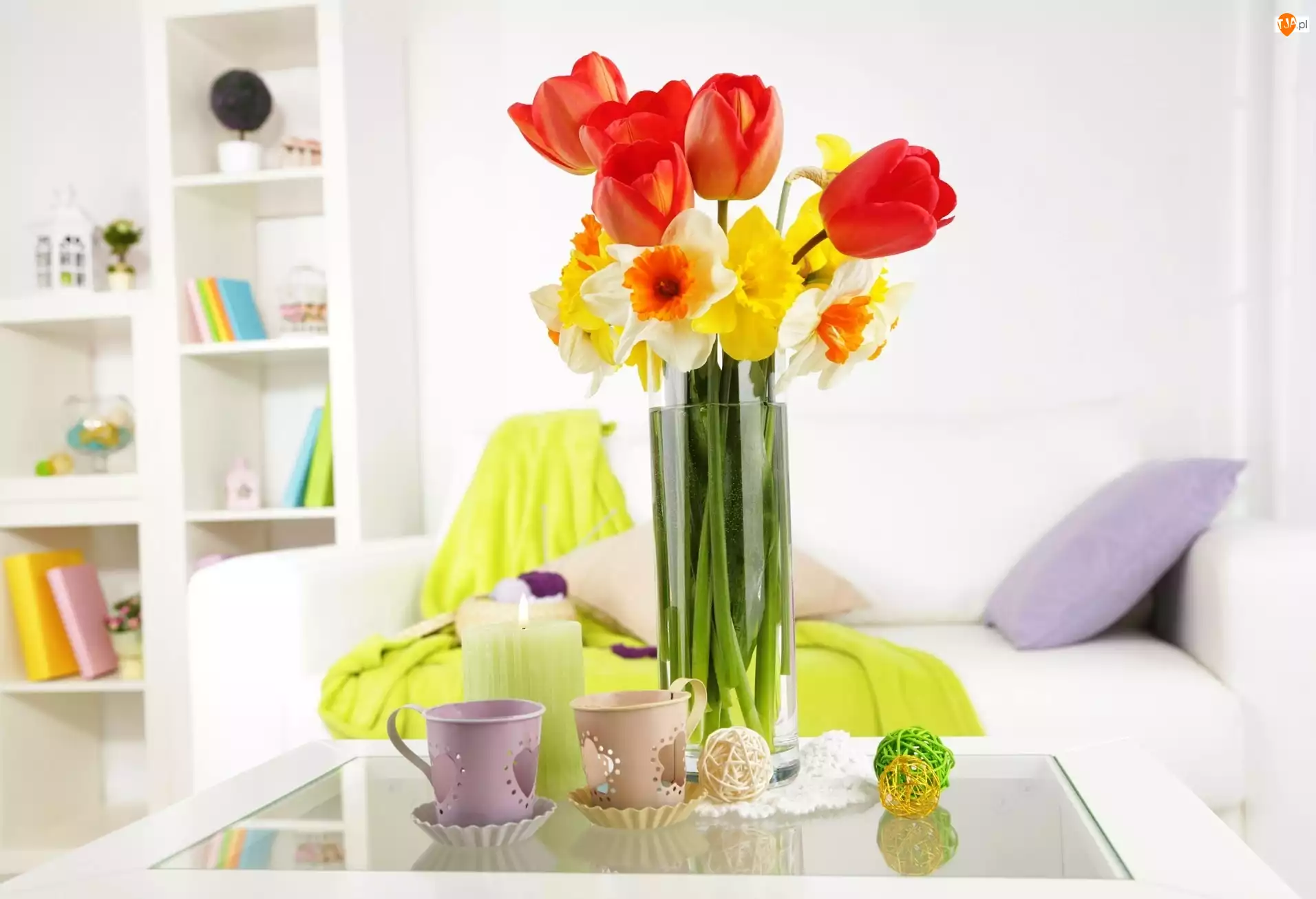 Stół, Żonkile, Wnętrze, Bukiet, Pokój, Tulipany