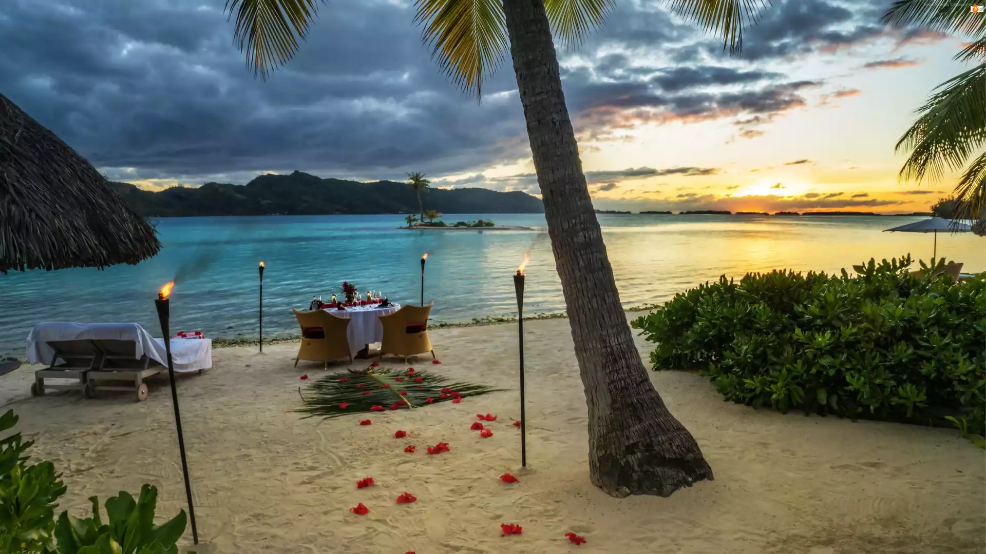 Stolik, Palmy, Zachód słońca, Morze, Chmury, Wz
