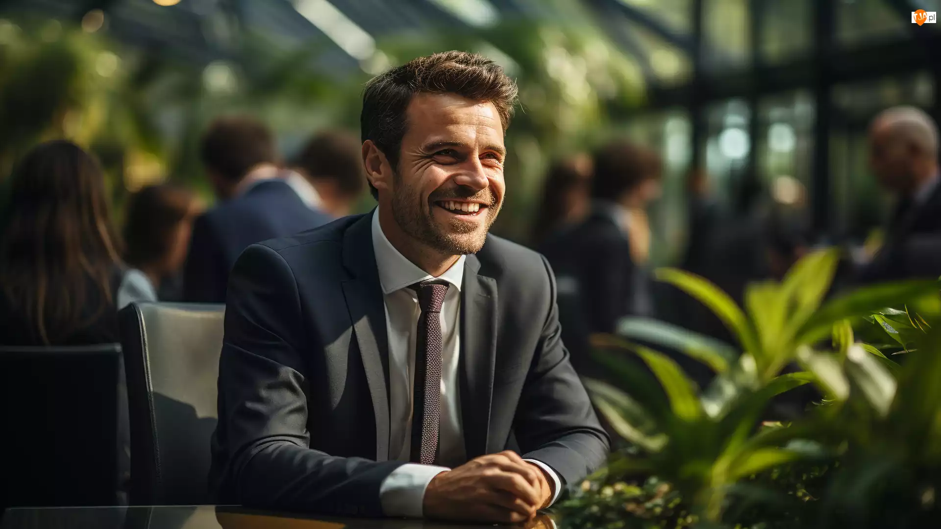 Stolik, Uśmiechnięty, Mężczyzna, Garnitur
