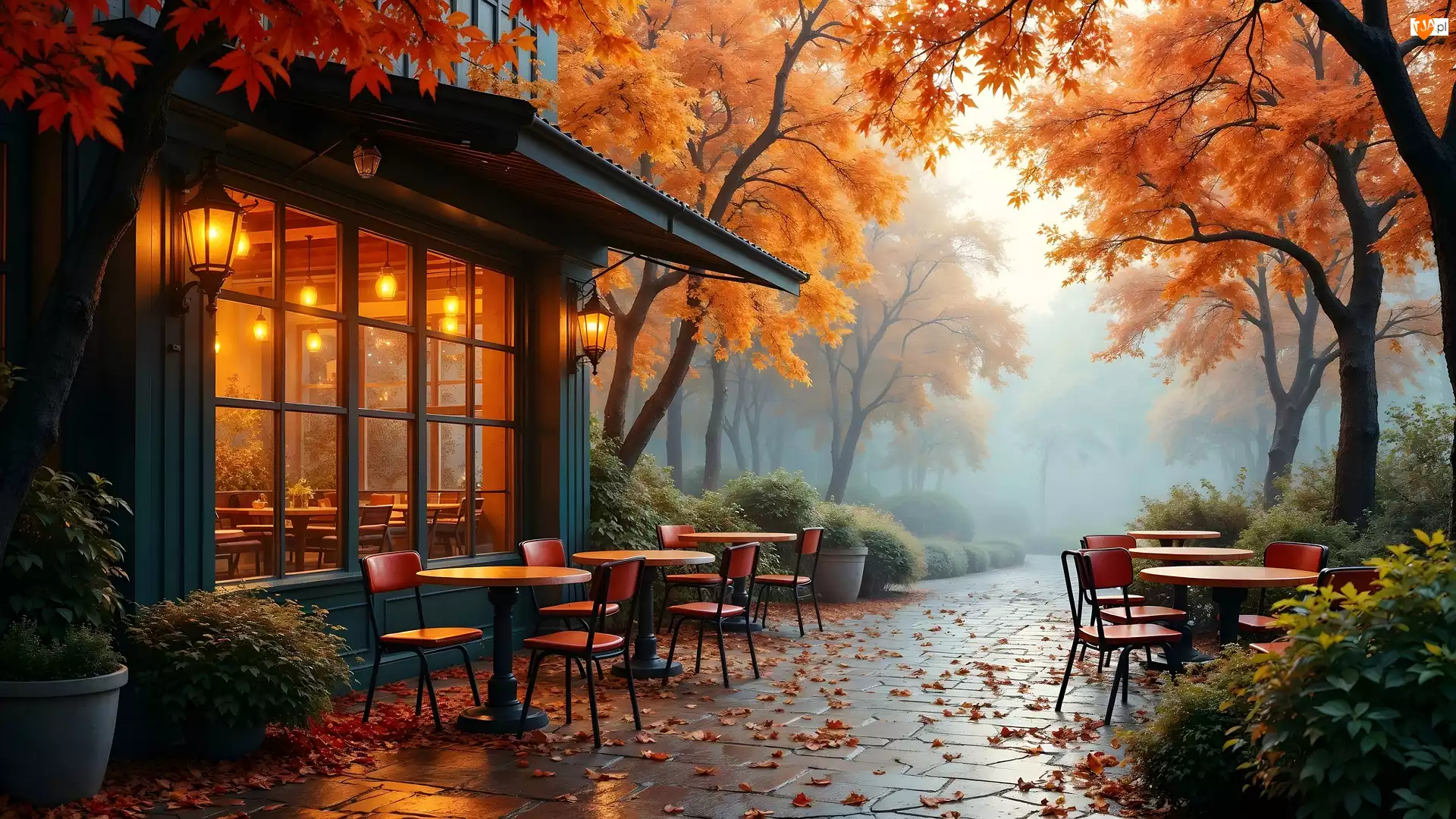 Restauracja, Latarnie, Drzewa, Jesień, Stoliki
