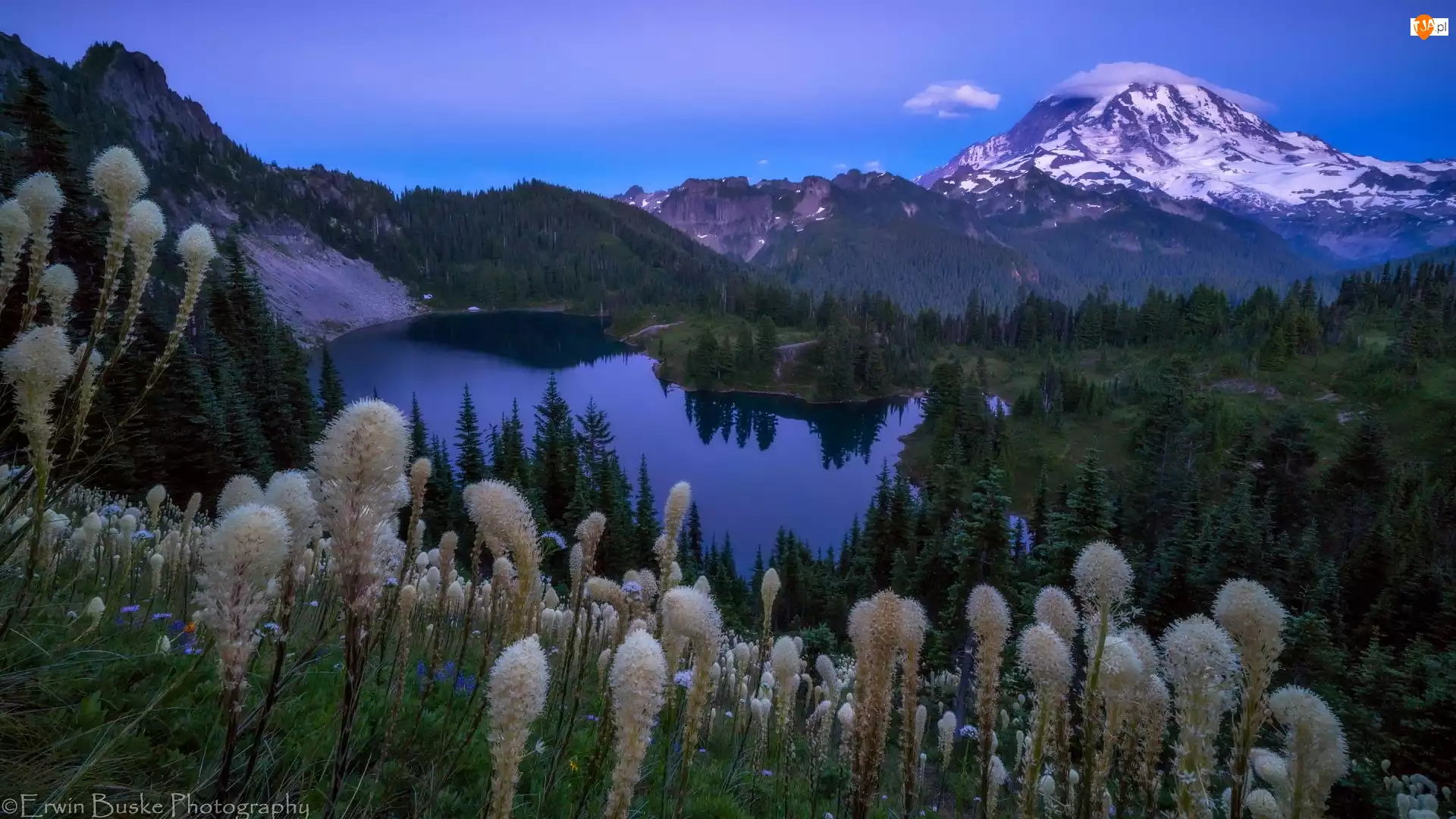 Góry, Drzewa, Wieczór, Jezioro, Rośliny, Stan Waszyngton, Stratowulkan Mount Rainier, Park Narodowy Mount Rainier, Zmierzch, Miądrzyga, Stany Zjednoczone