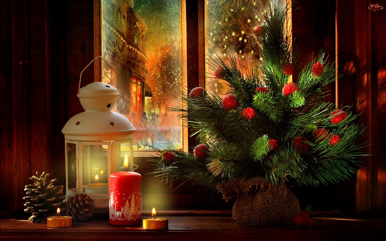 Świeca, Okno, Lampion, Stroik, Kompozycja, Świąteczne, Boże Narodzenie