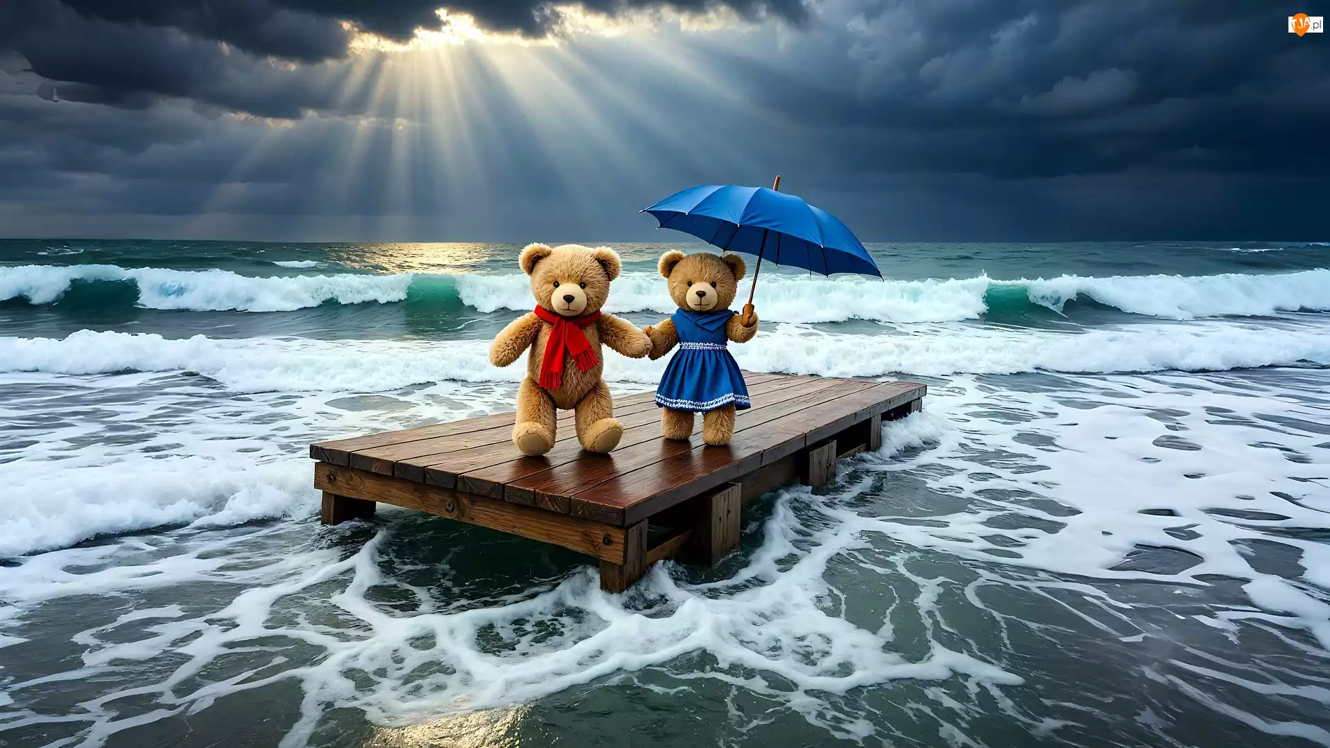 Strój, Morze, Dwa, Chmury, Fale, Misie, Przebijające światło, Pomost