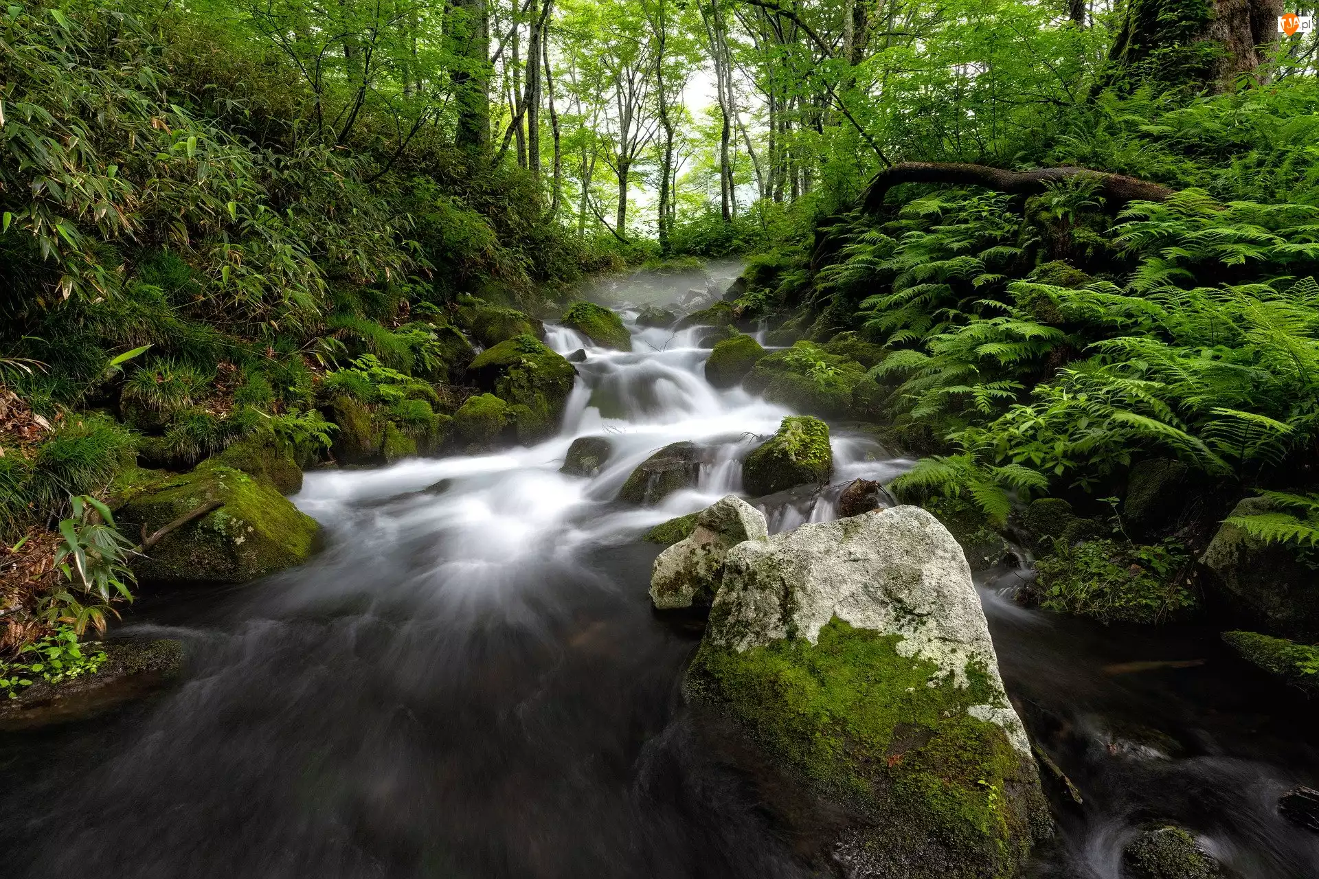 Drzewa, Paprocie, Rzeka, Las, Strumień, Kamienie, Skała