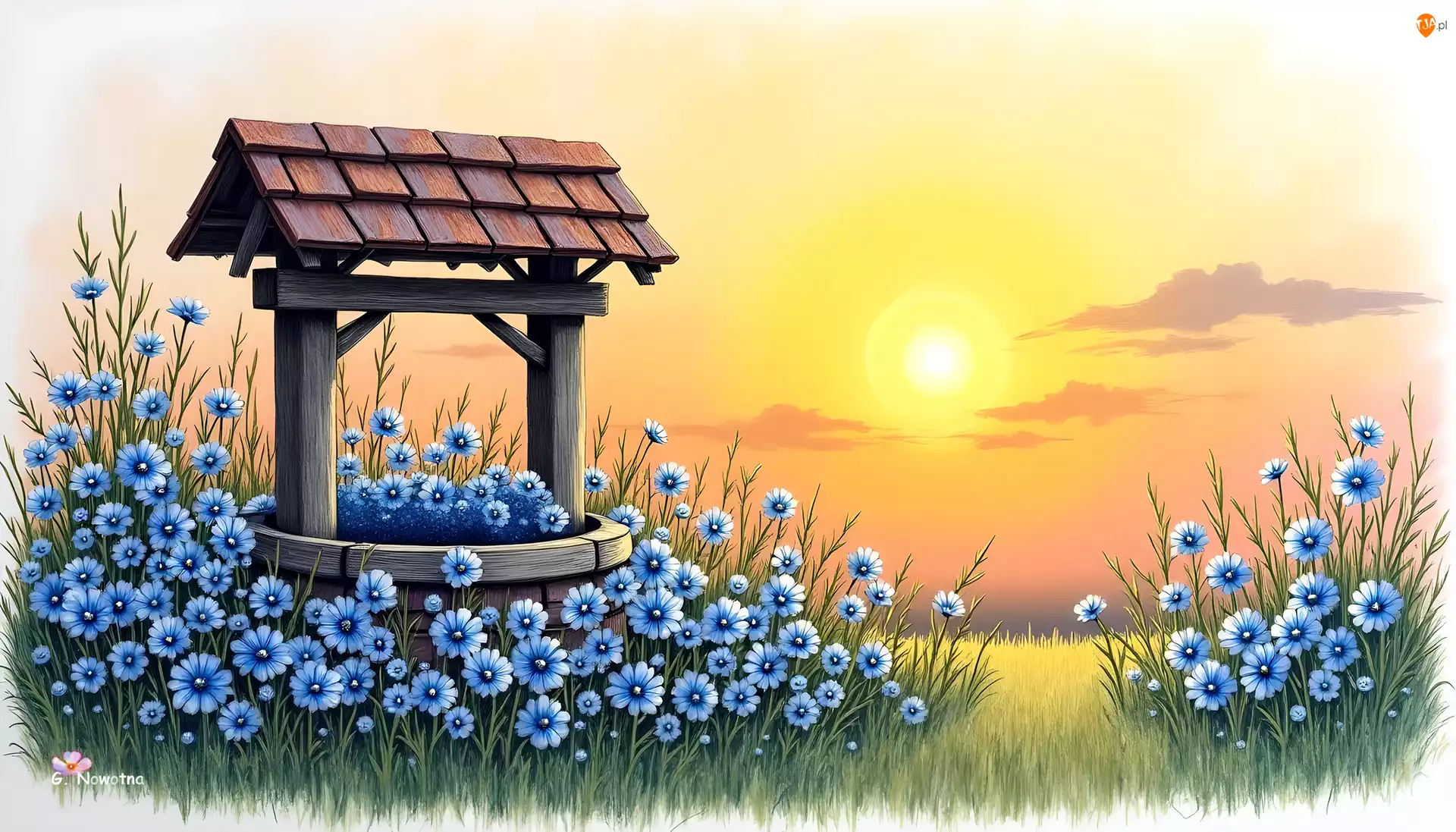 Studnia, 2D, Kwiaty, Niebieskie, Zachód słońca