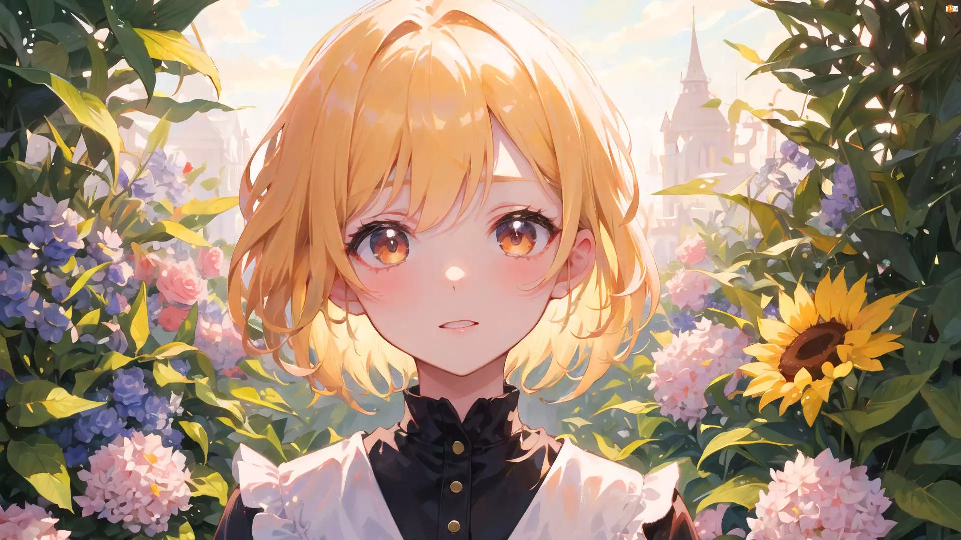 Sukienka, Anime, Blondynka, Dziewczyna, Kwiaty